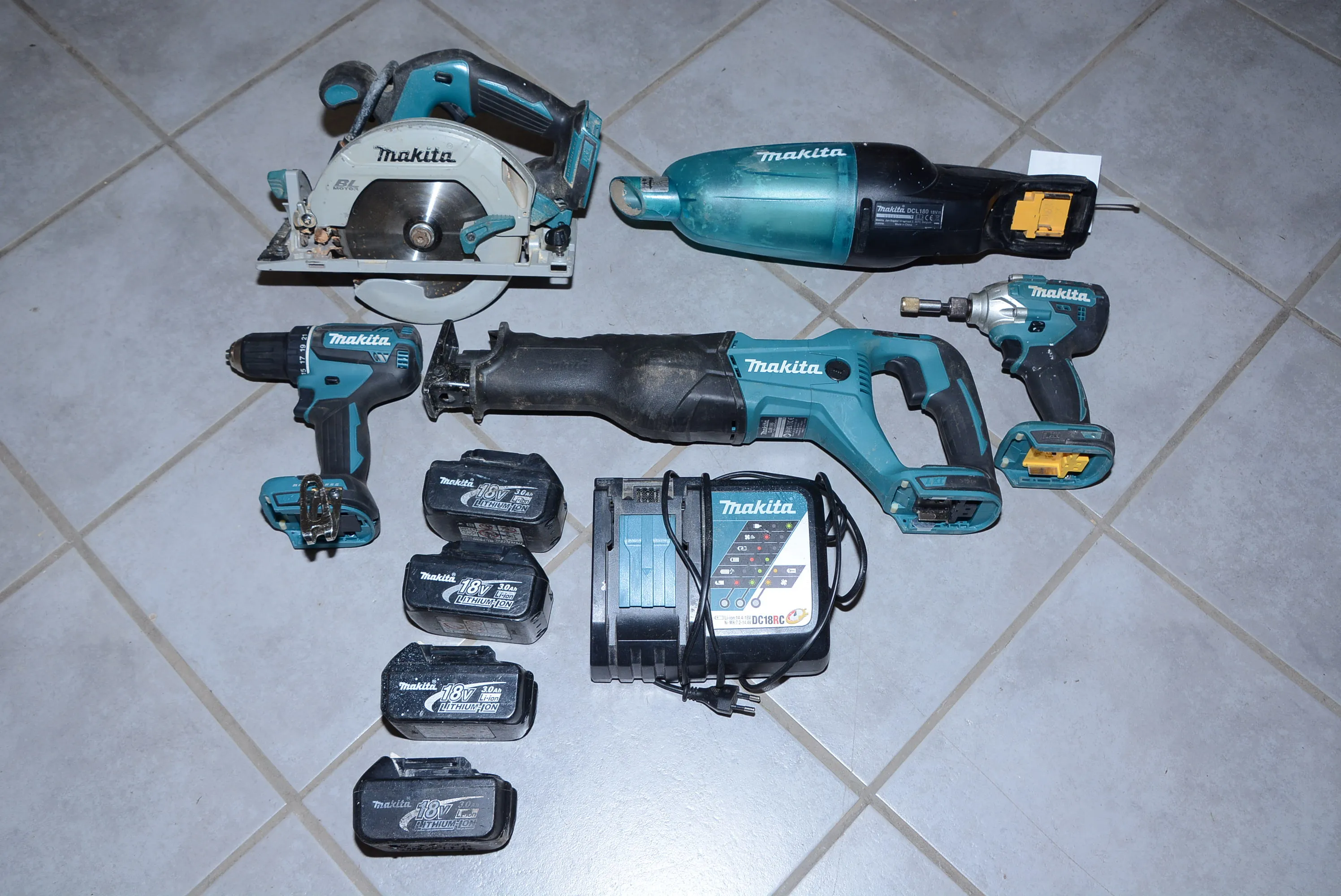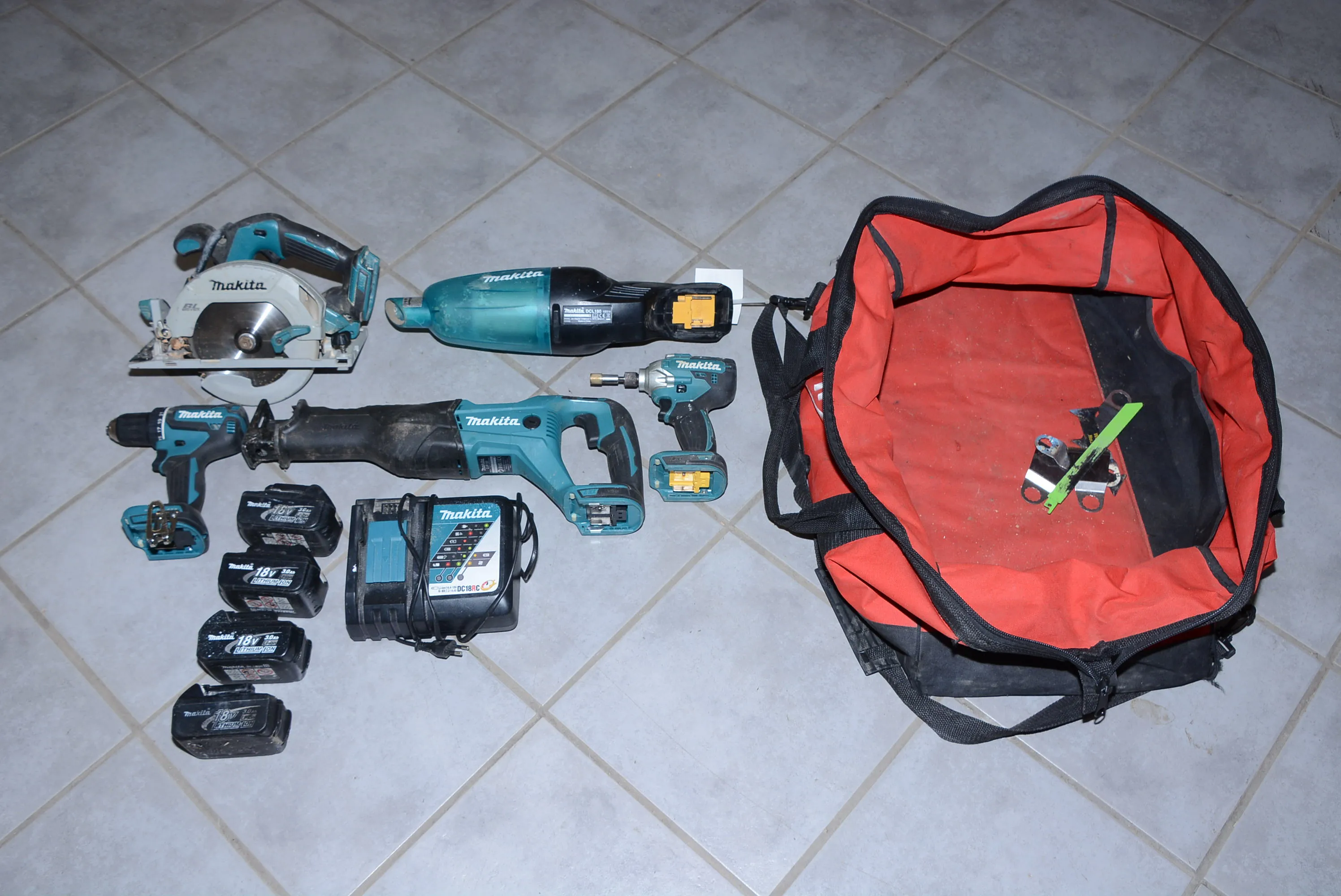 323. Batteriverktyg Makita tigersåg, skruvdragare, dammsugare, cirkelsåg, laddare, batterier mm