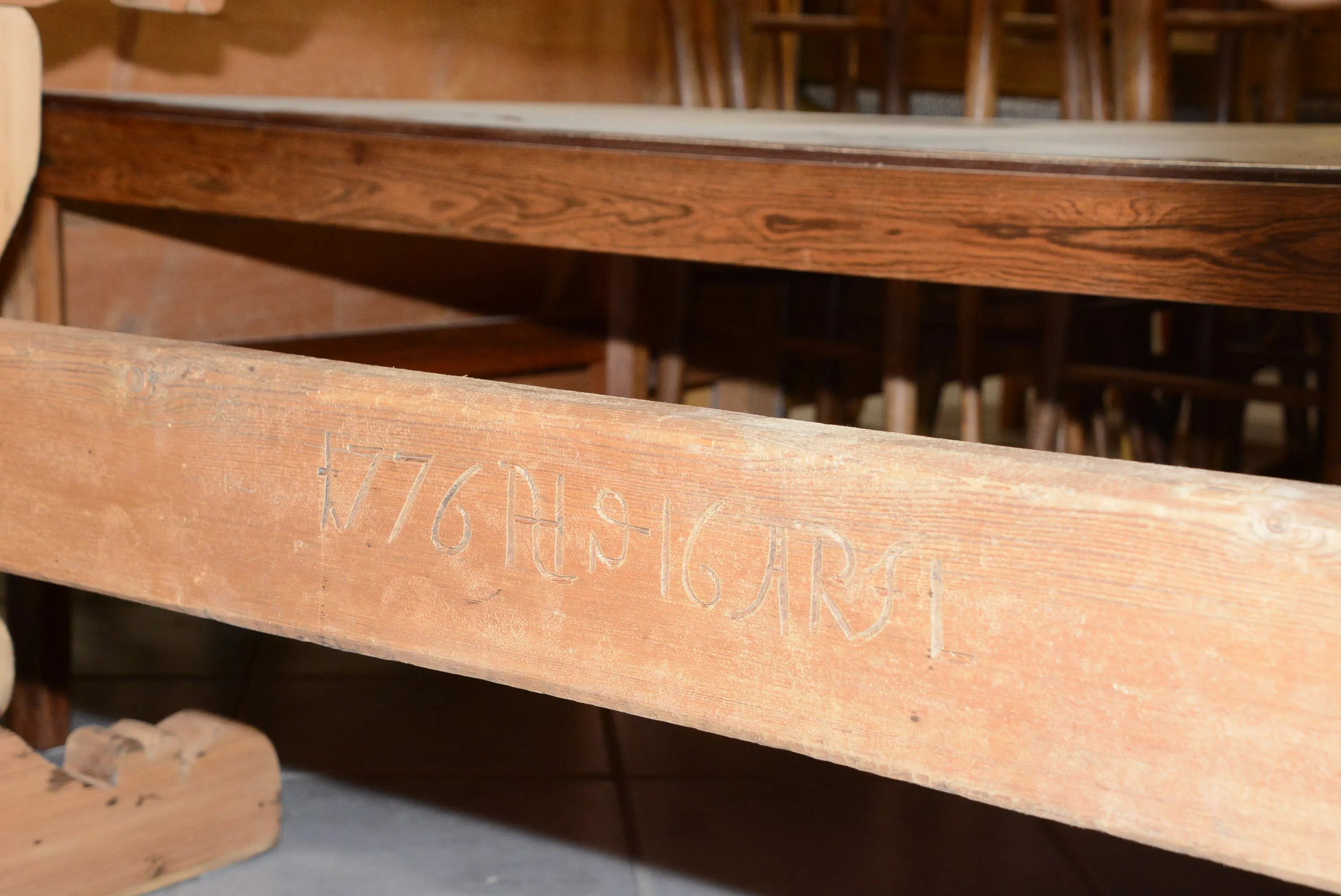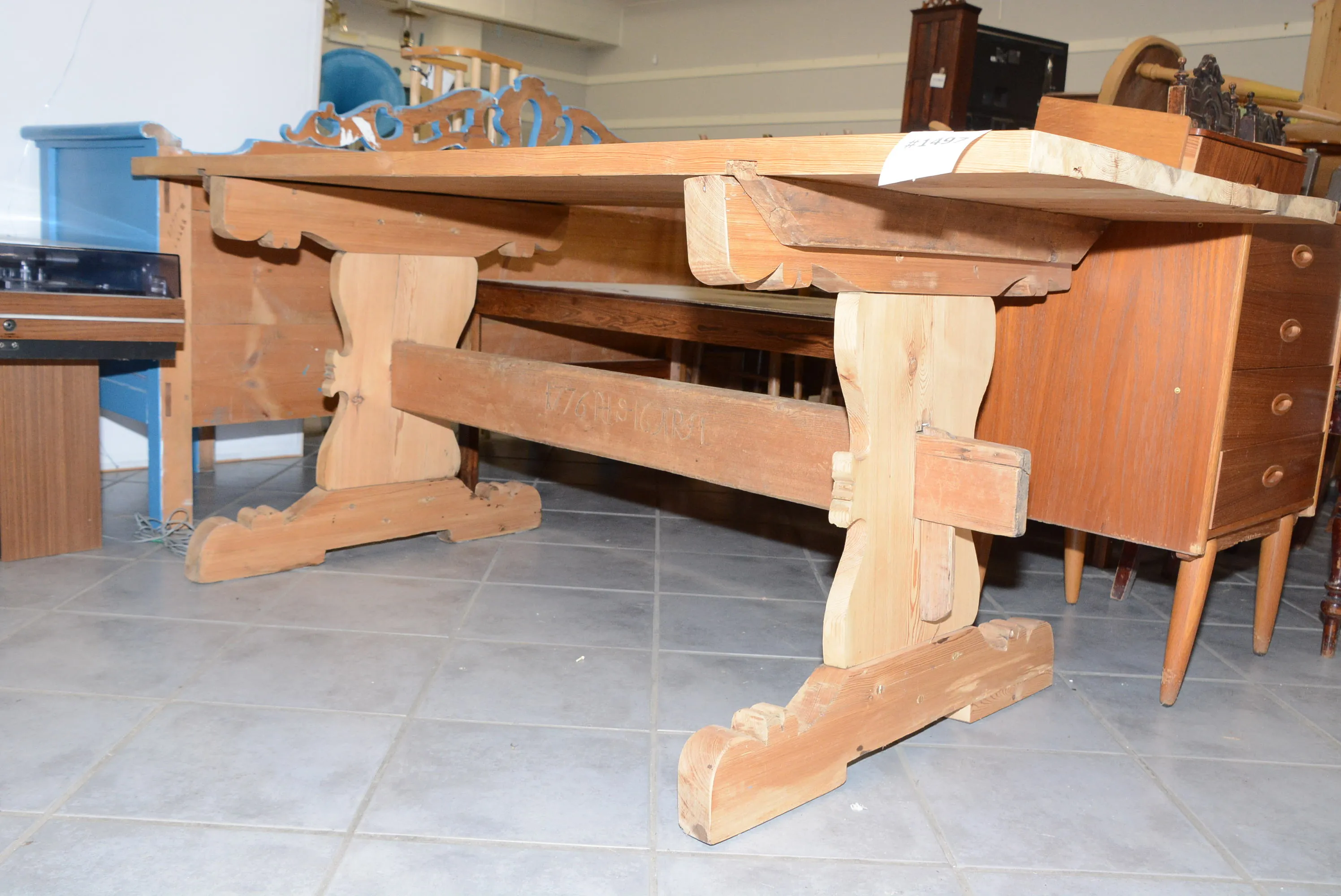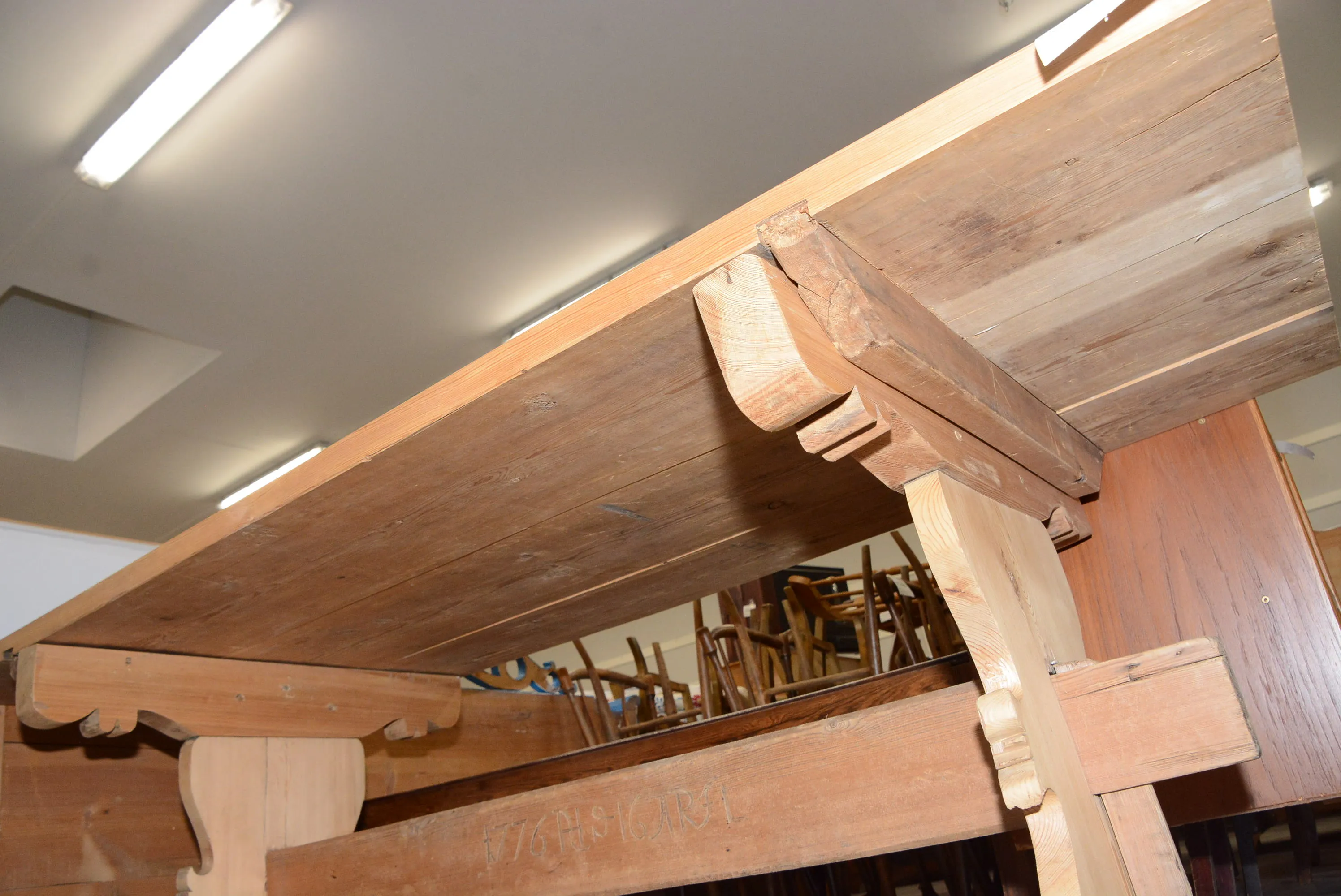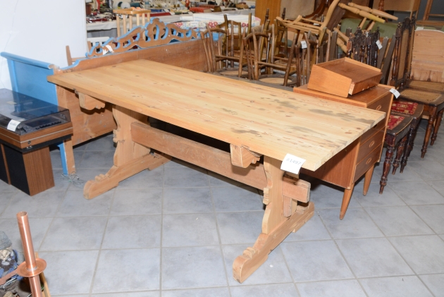 1497. Bockbord med profilerad bock daterat 1776 skivan slipad, gammal undersida 180x80 cm, H: 73 cm