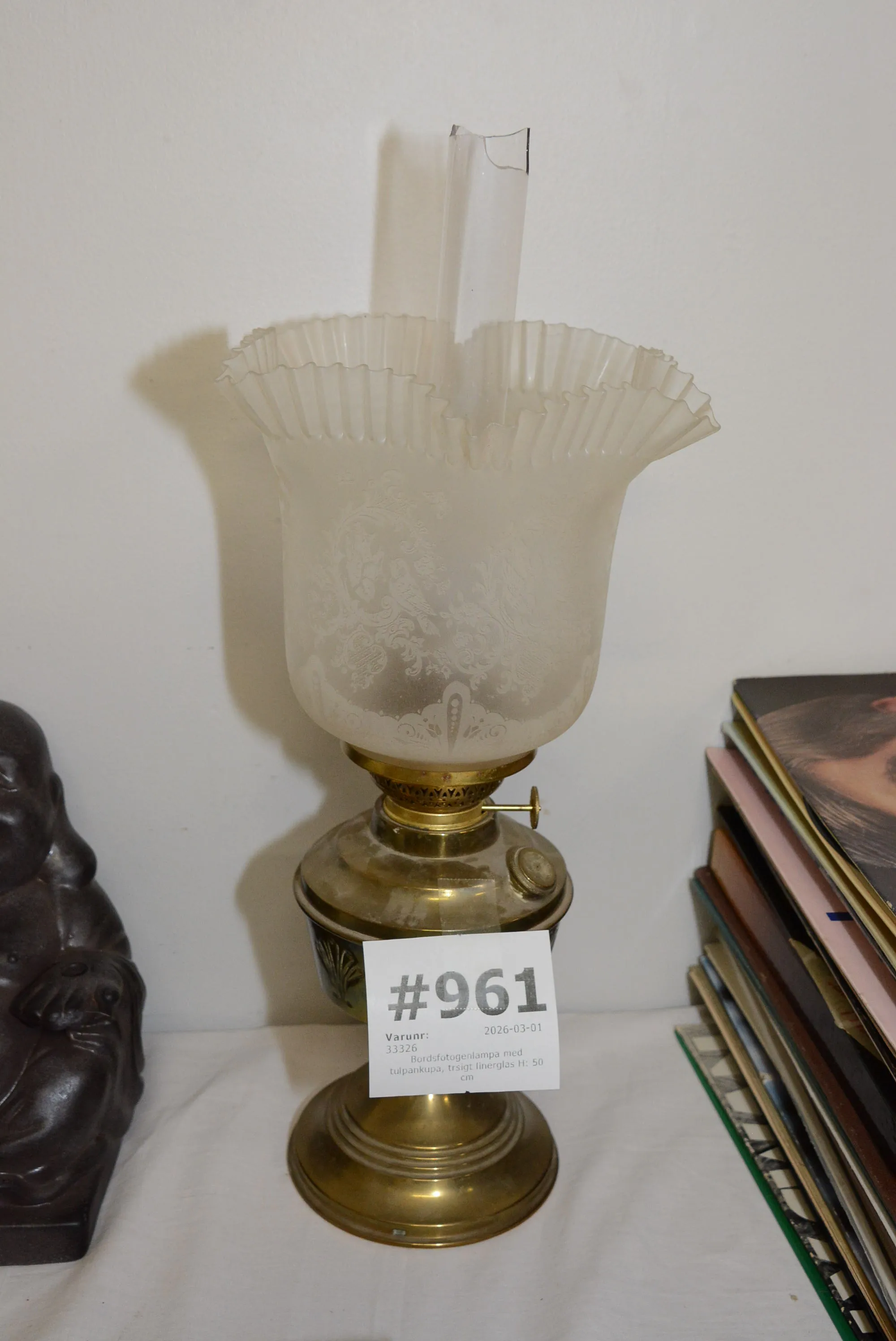 961. Bordsfotogenlampa med tulpankupa, trasigt linerglas H: 50 cm