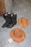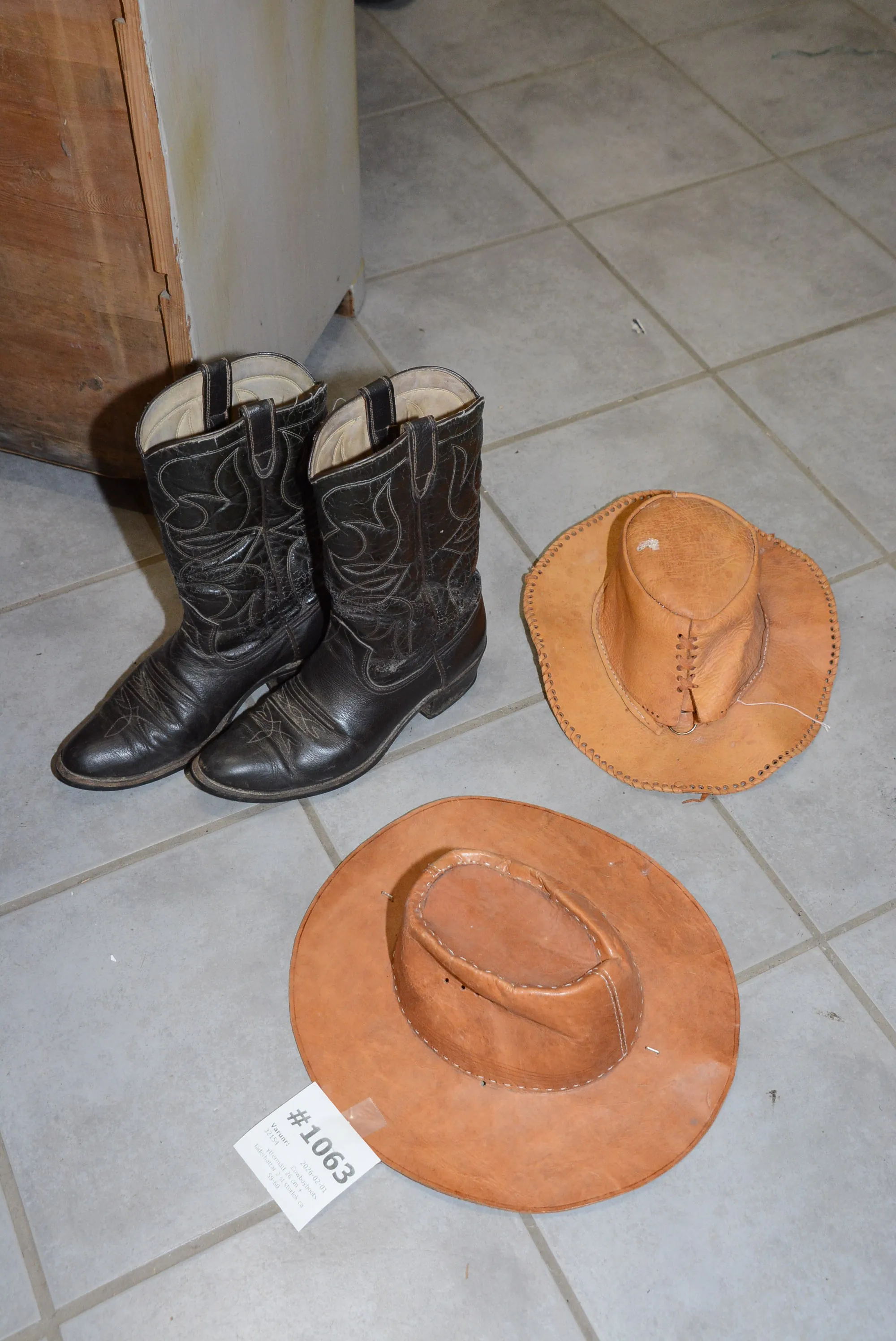 1063. Cowboyboots yttermått 26 cm + läderhattar 2 st storlek ca 59-60