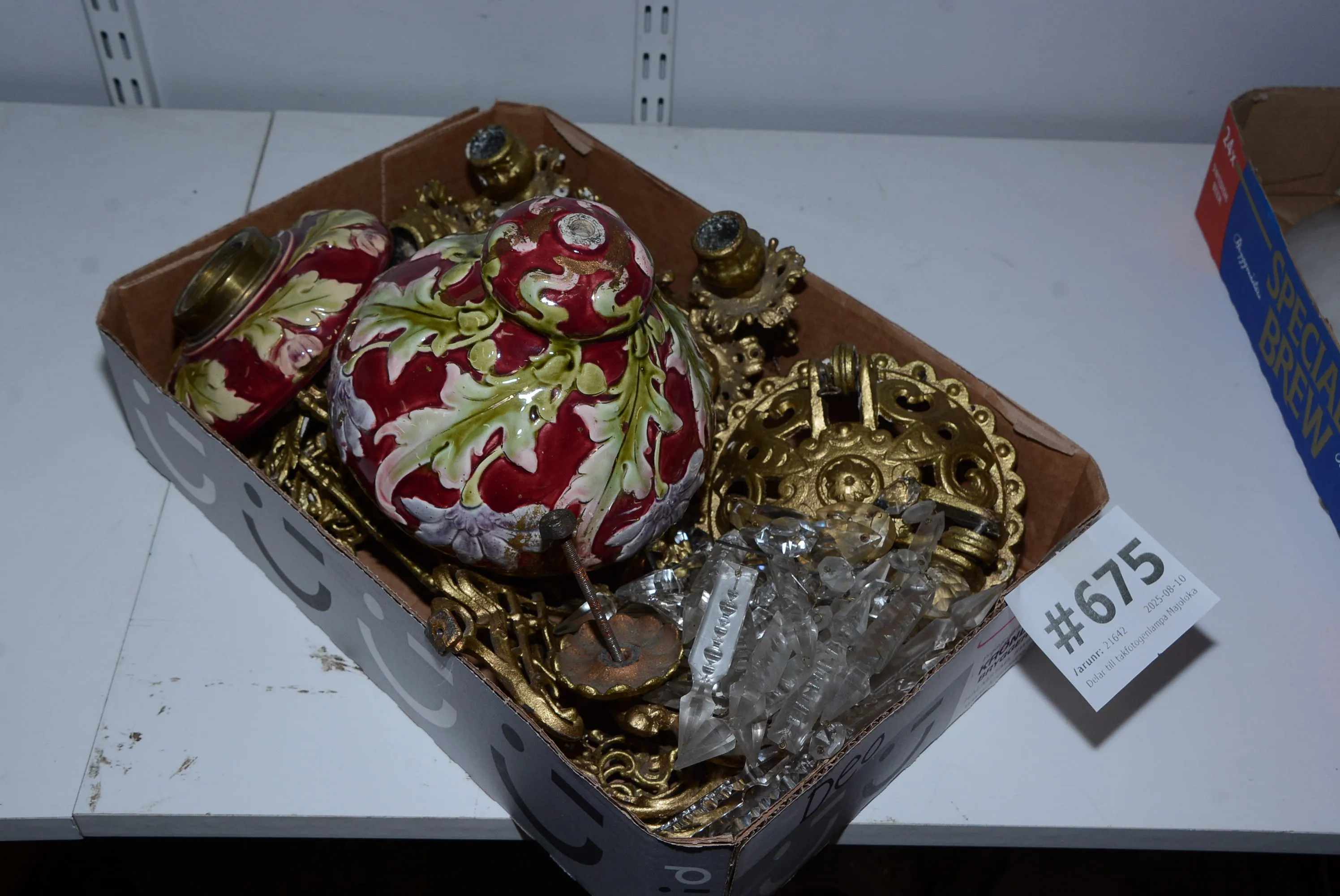 675. Delar till takfotogenlampa Majolika