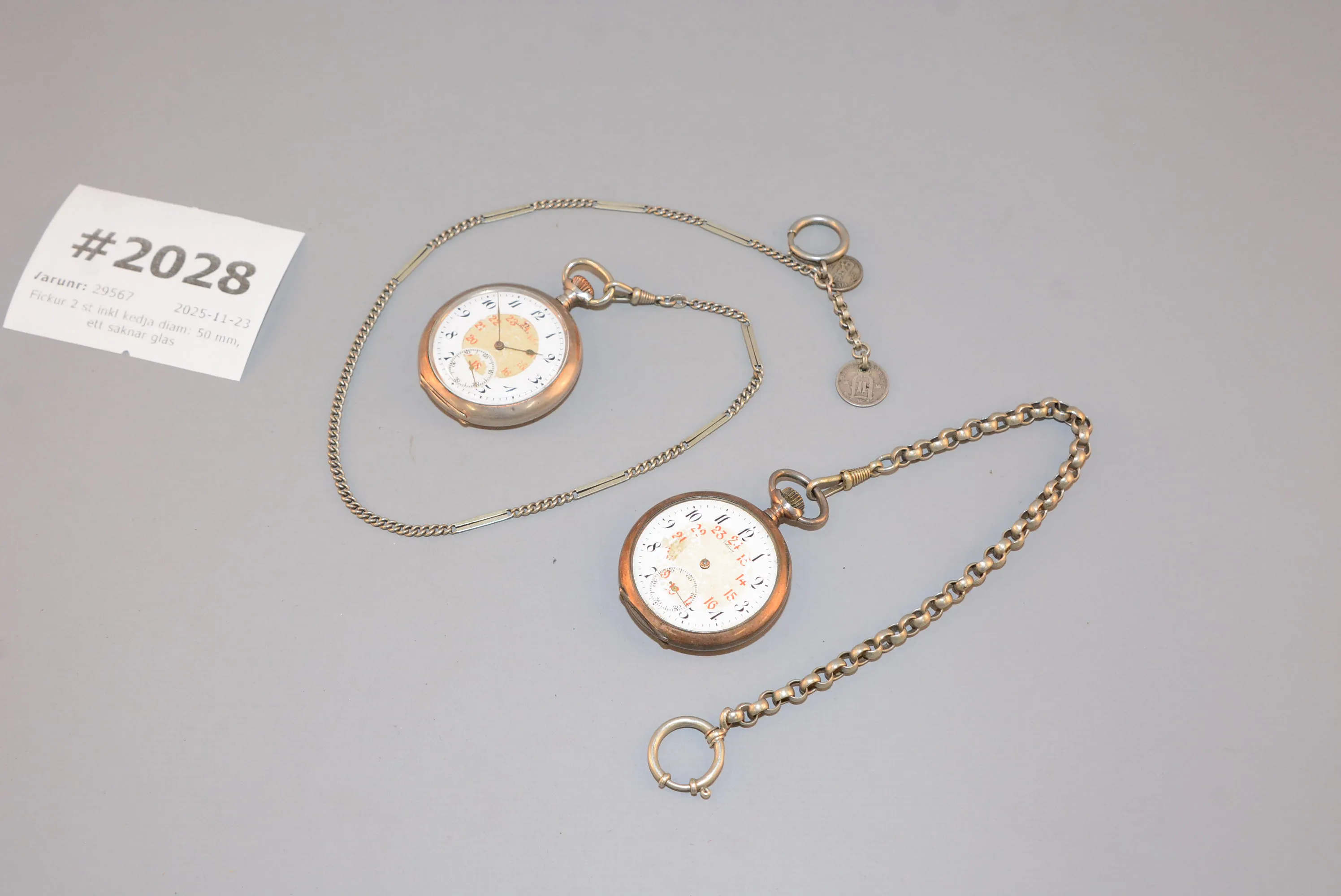 2028. Fickur 2 st inkl kedja diam: 50 mm, ett saknar glas