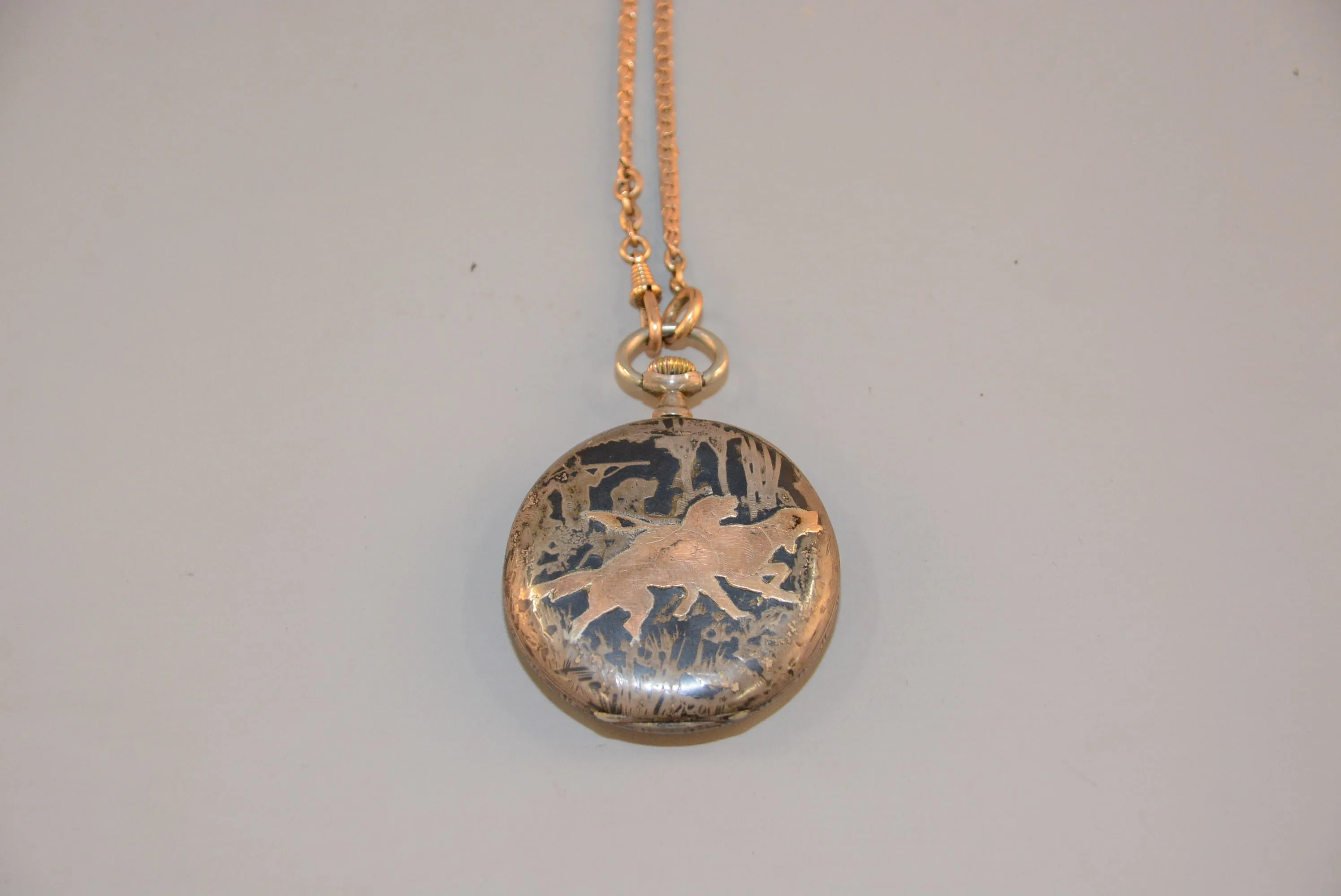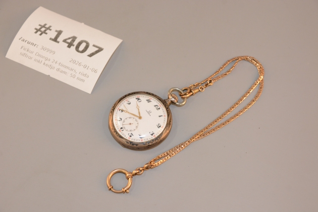 1407. Fickur Omega 24-timmars, röda siffror inkl kedja diam: 50 mm
