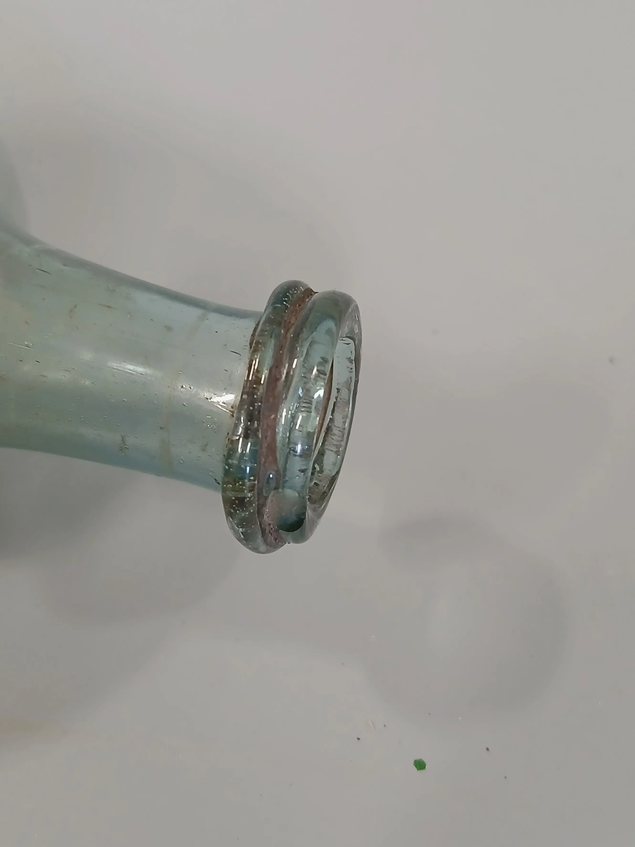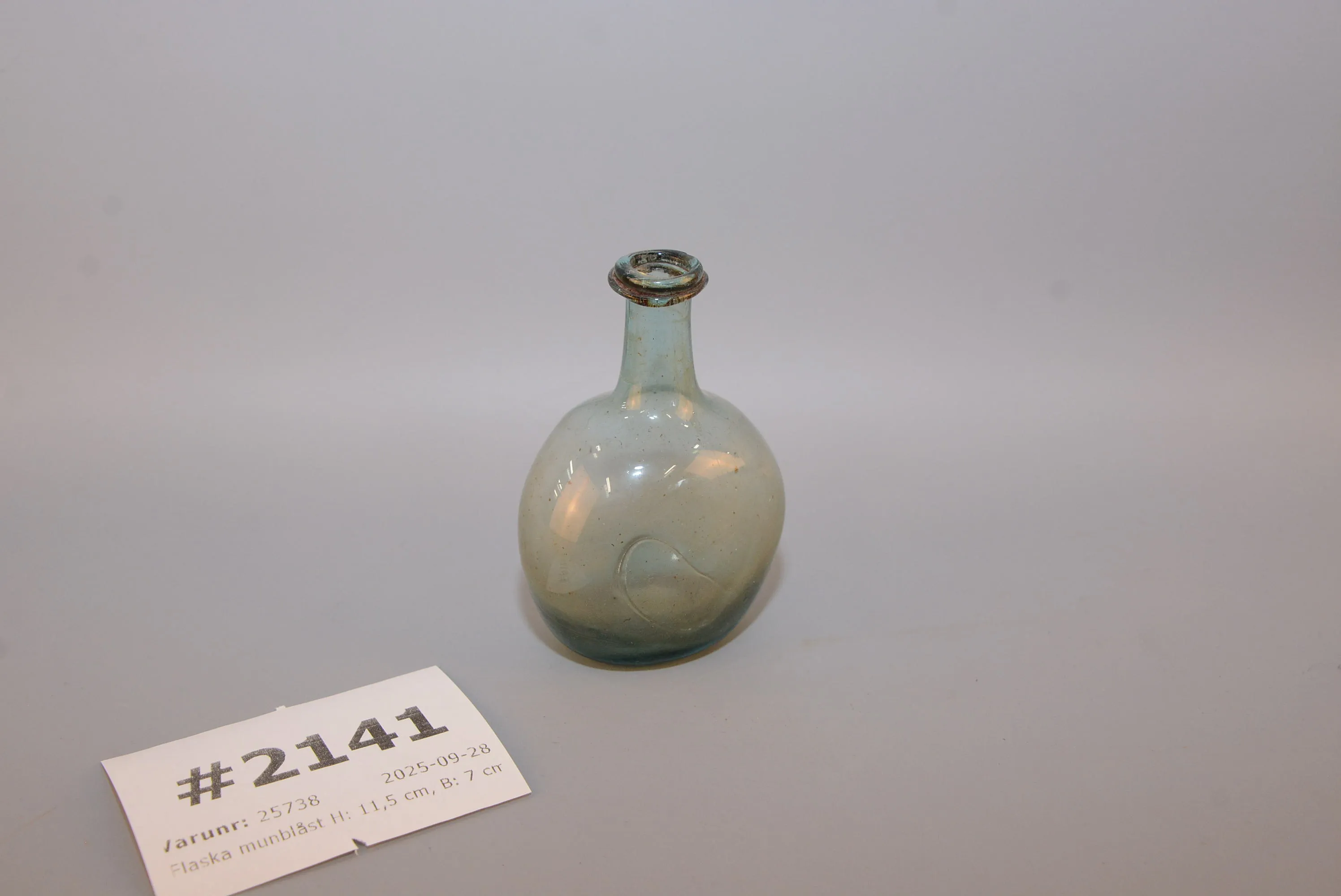 2141. Flaska munblåst H: 11,5 cm, B: 7 cm, nagg på kanten