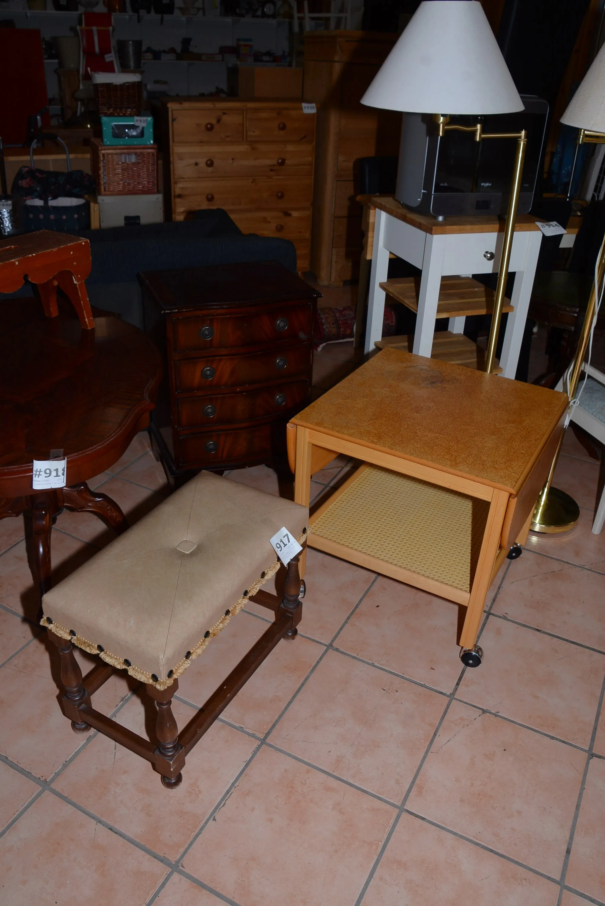 917. Fotpall, byrå 4-lådig H: 70 cm + soffbord på hjul