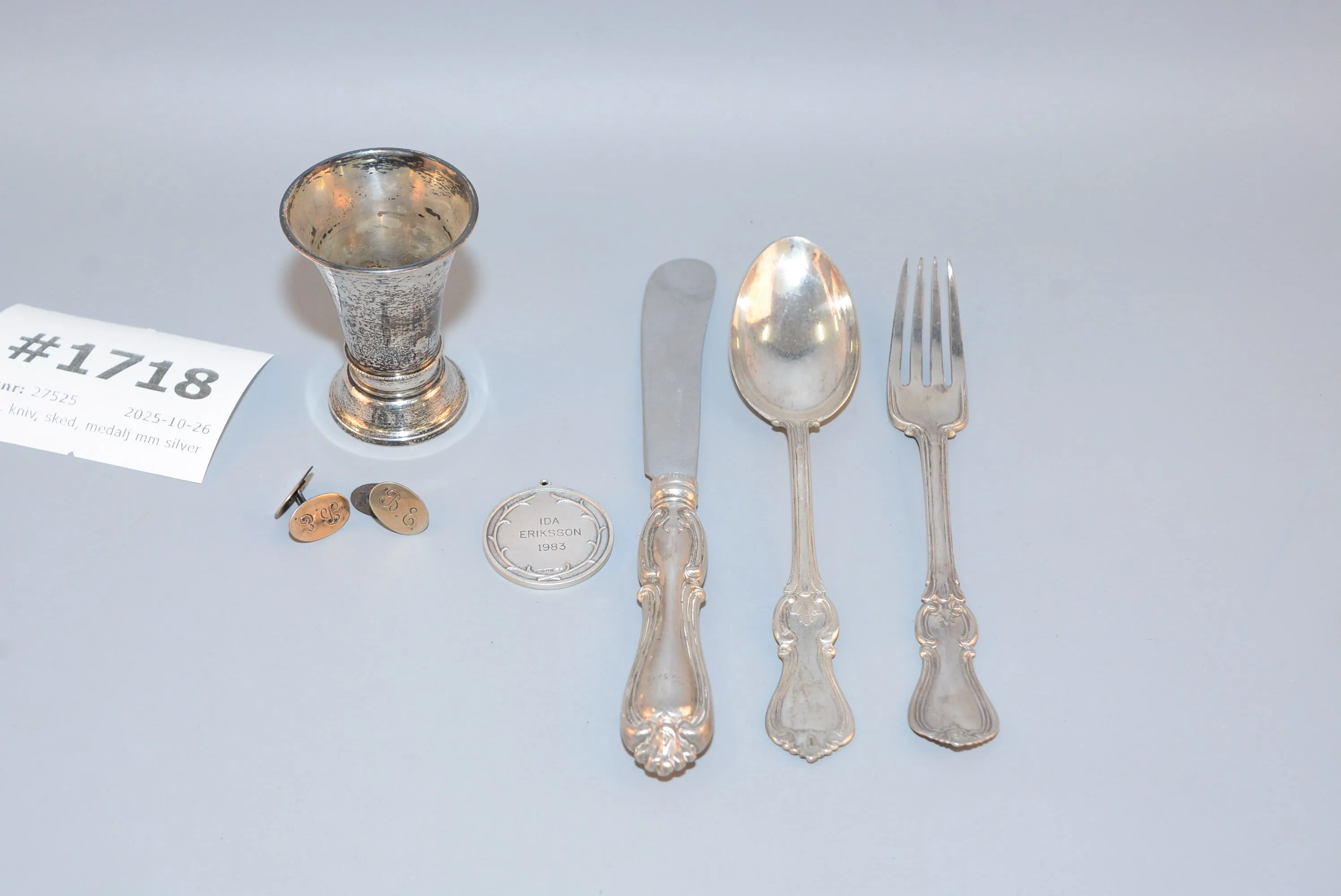 1718. Gaffel, kniv, sked, medalj mm silver