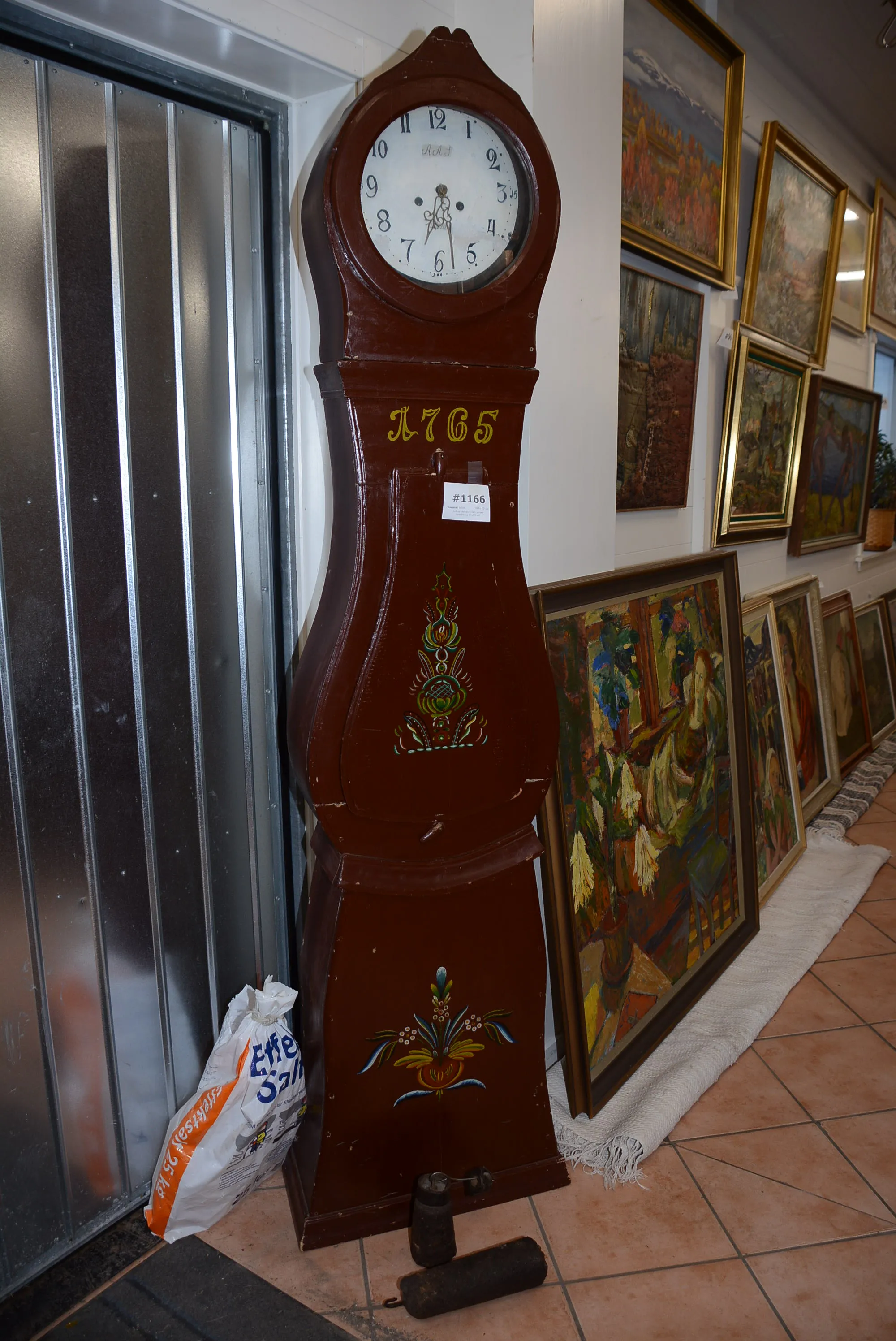 1166. Golvur daterat 1765 senare bemålning H: 203 cm