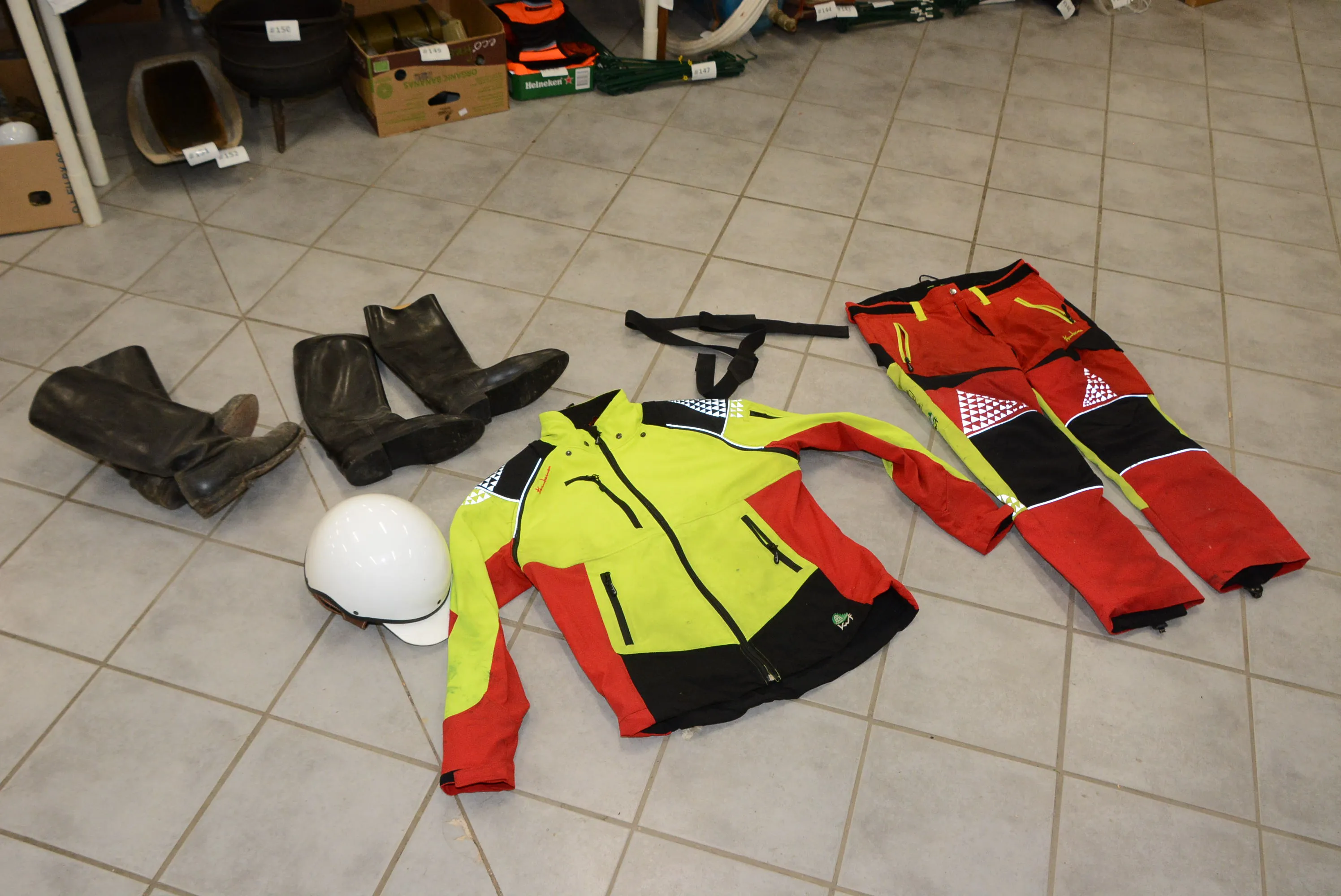 157. Huggarjacka storlek XXL +huggarbyxor storlek XL, ridstövlar, Travhjälm