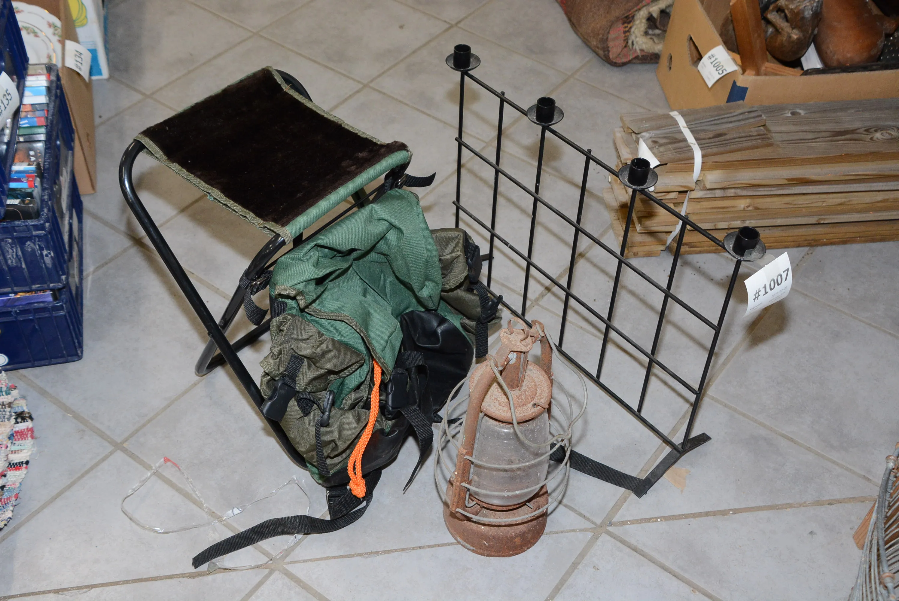 1007. Jaktryggsäck, fotogenlykta + ljusstake