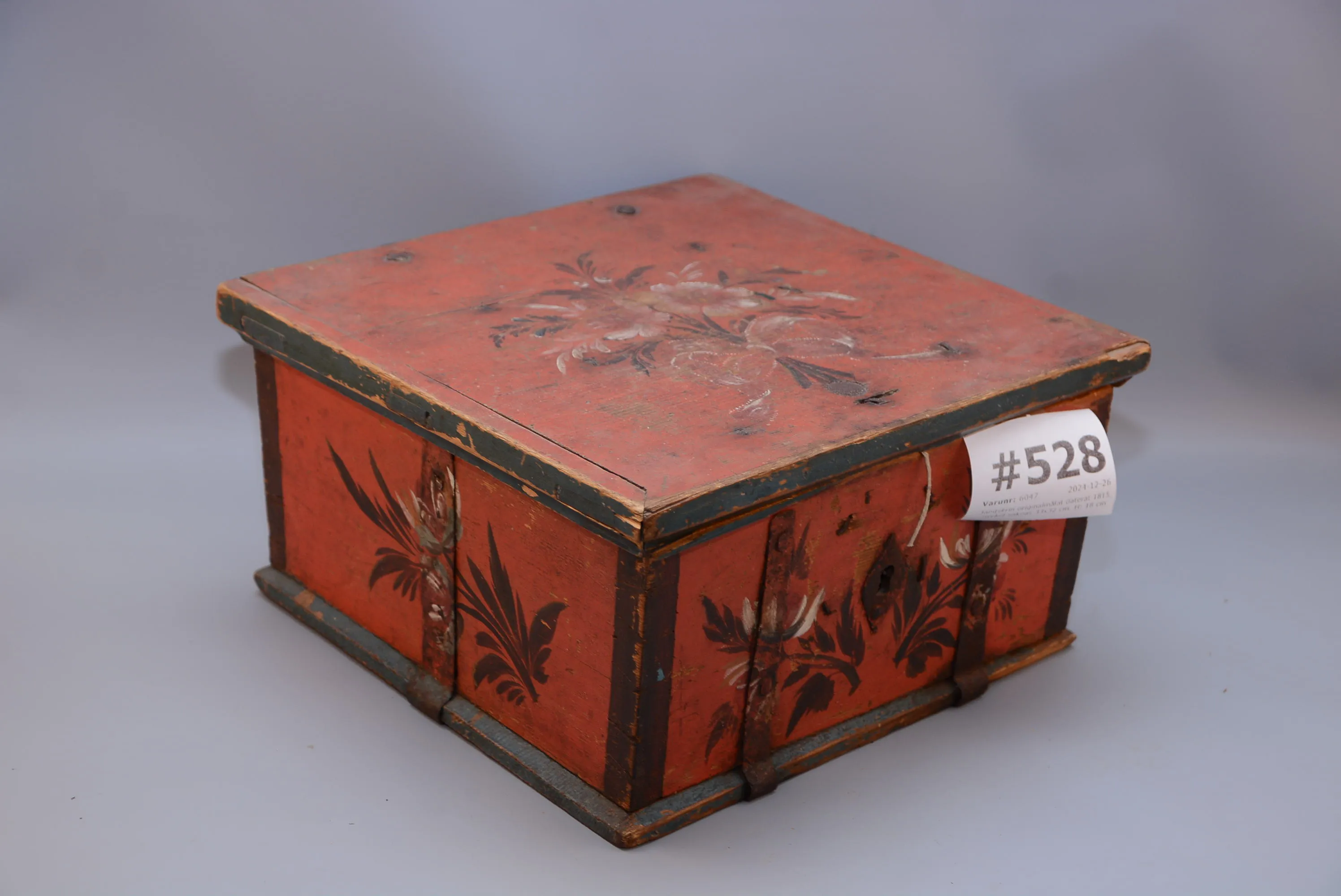 528. Jämtskrin originalmålat daterat 1815, nyckel saknas 33x32 cm, H: 18 cm