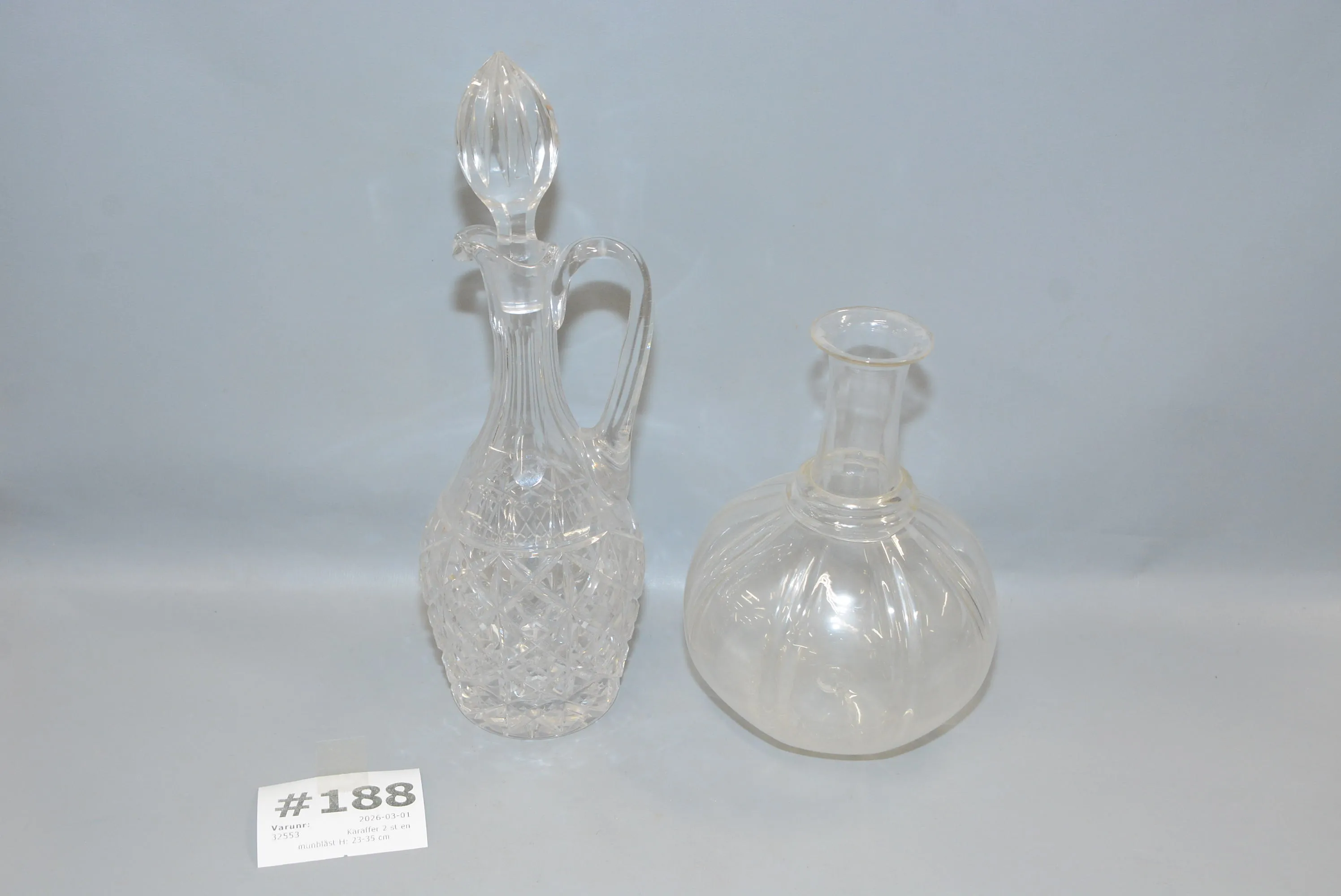 188. Karaffer 2 st en munblåst H: 23-35 cm