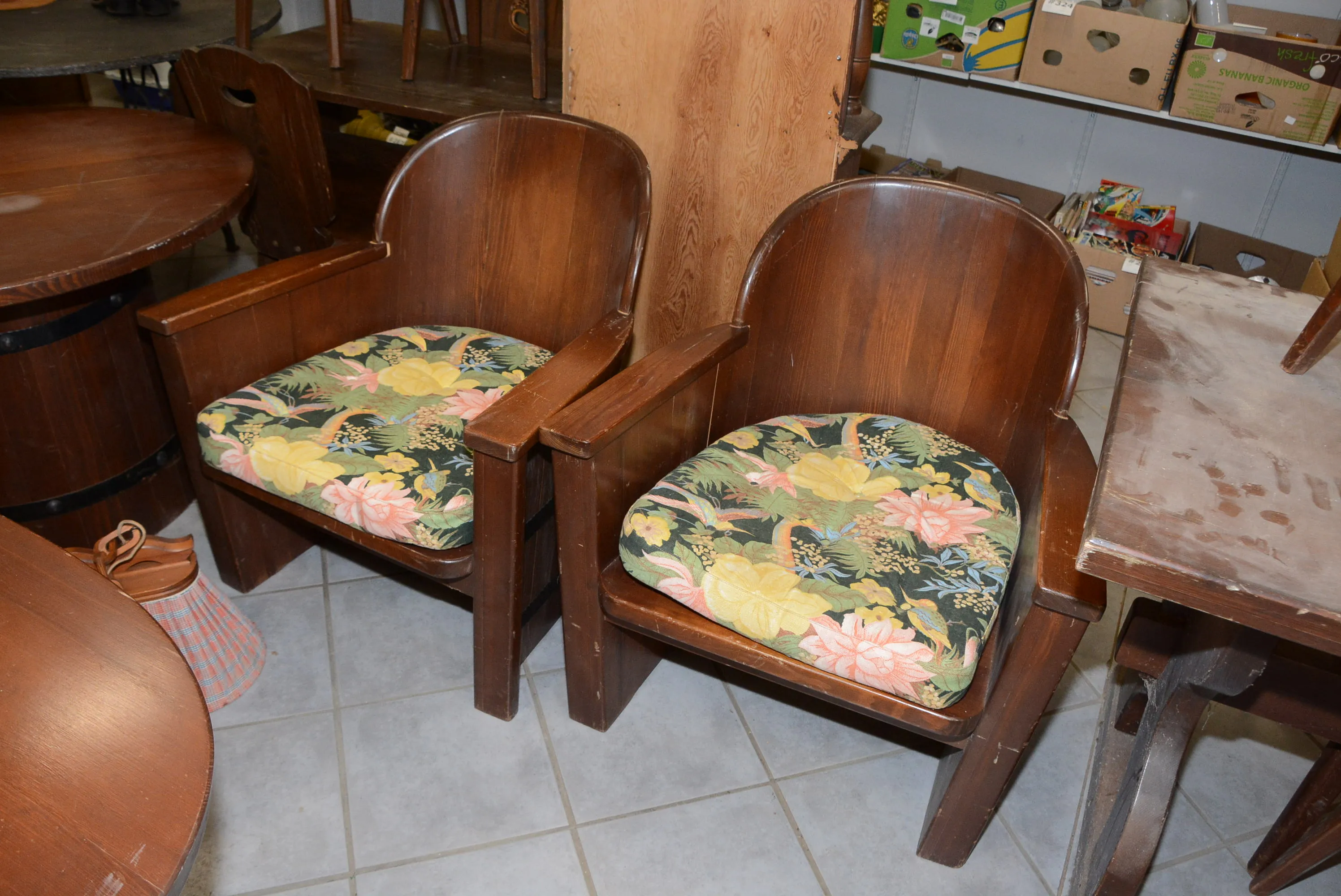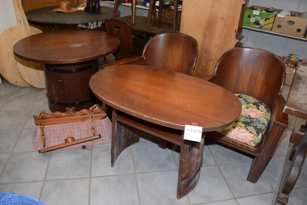 1070. Karmstolar 2 st B: 70 cm, H: 75 cm, bord 2 st diam: 95 cm, H: 66 cm, 95x60 cm, H: 65 cm + taklampa L: 60 cm
