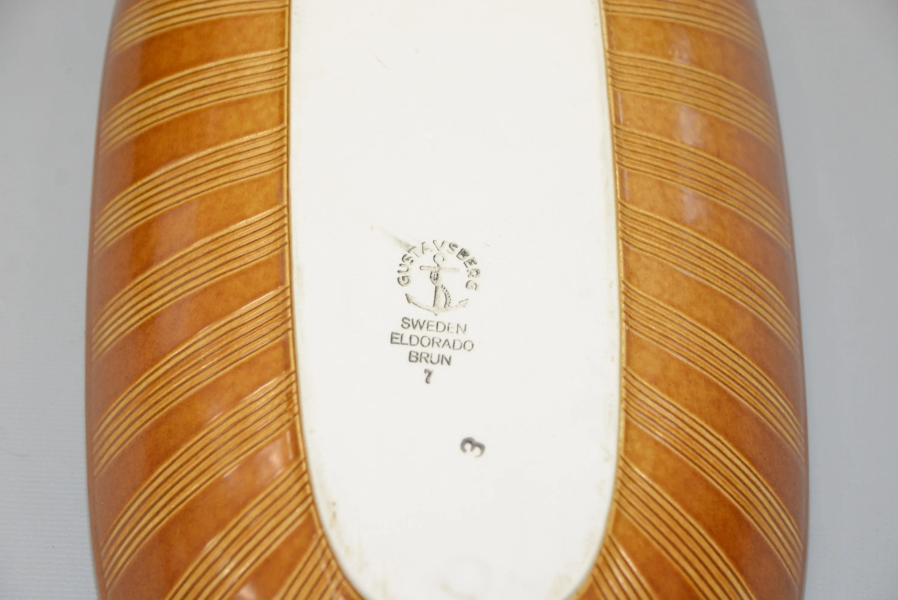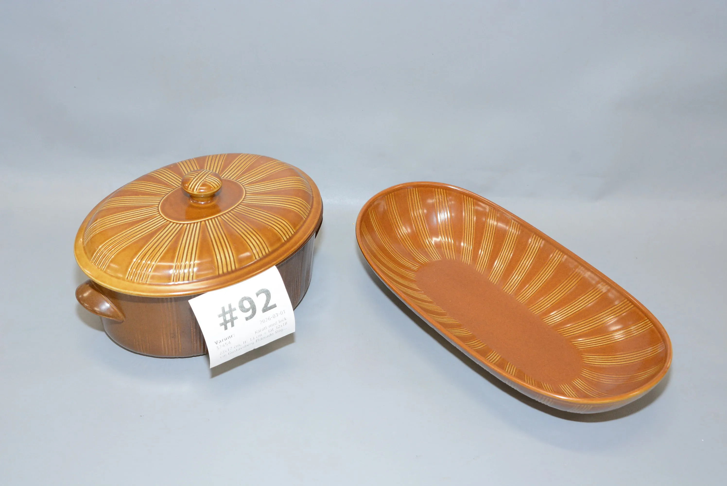92. Karott med lock "Eldorado" Stig Lindberg/ Gustavsberg 22x17 cm, H: 13 cm + fat 32x18 cm