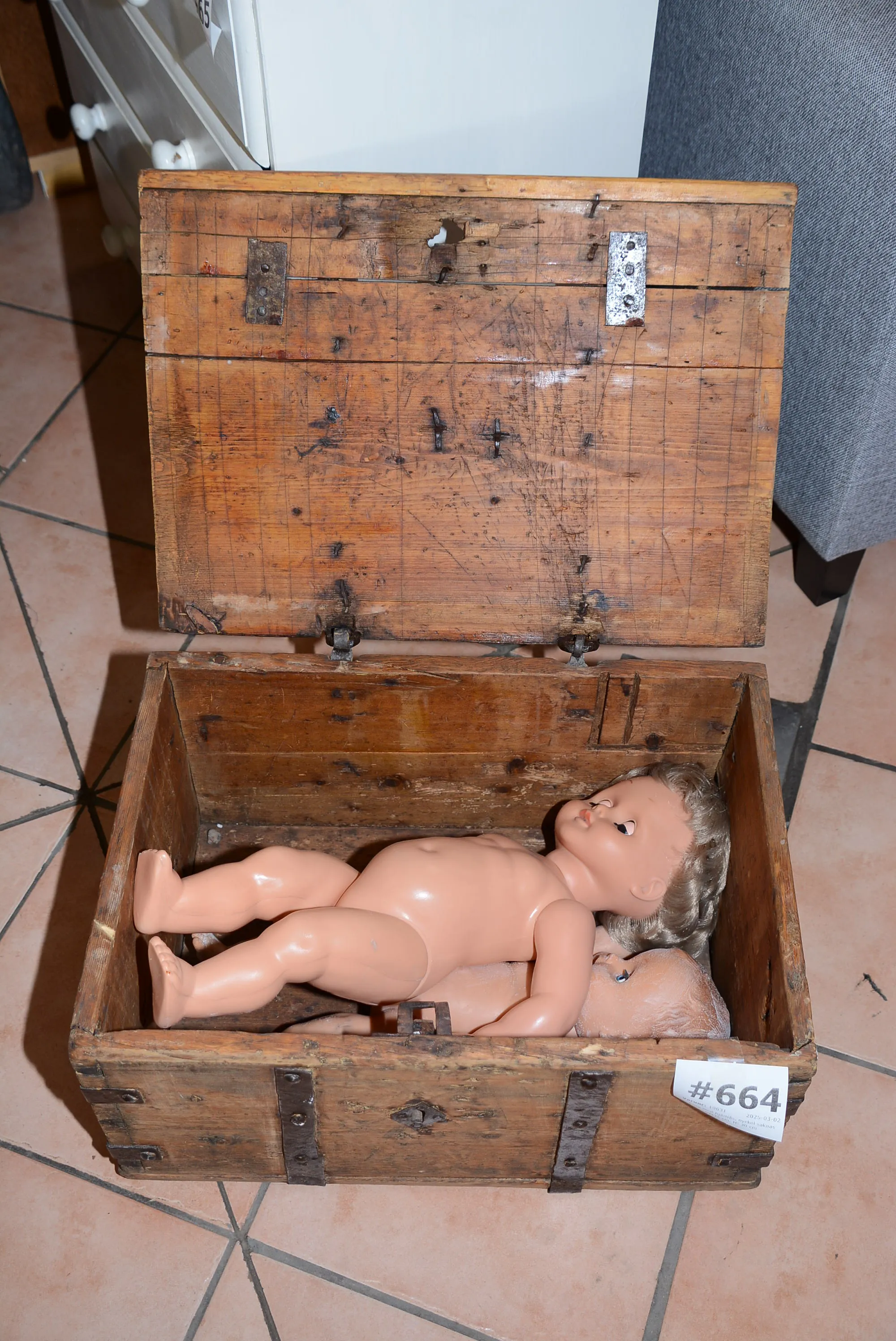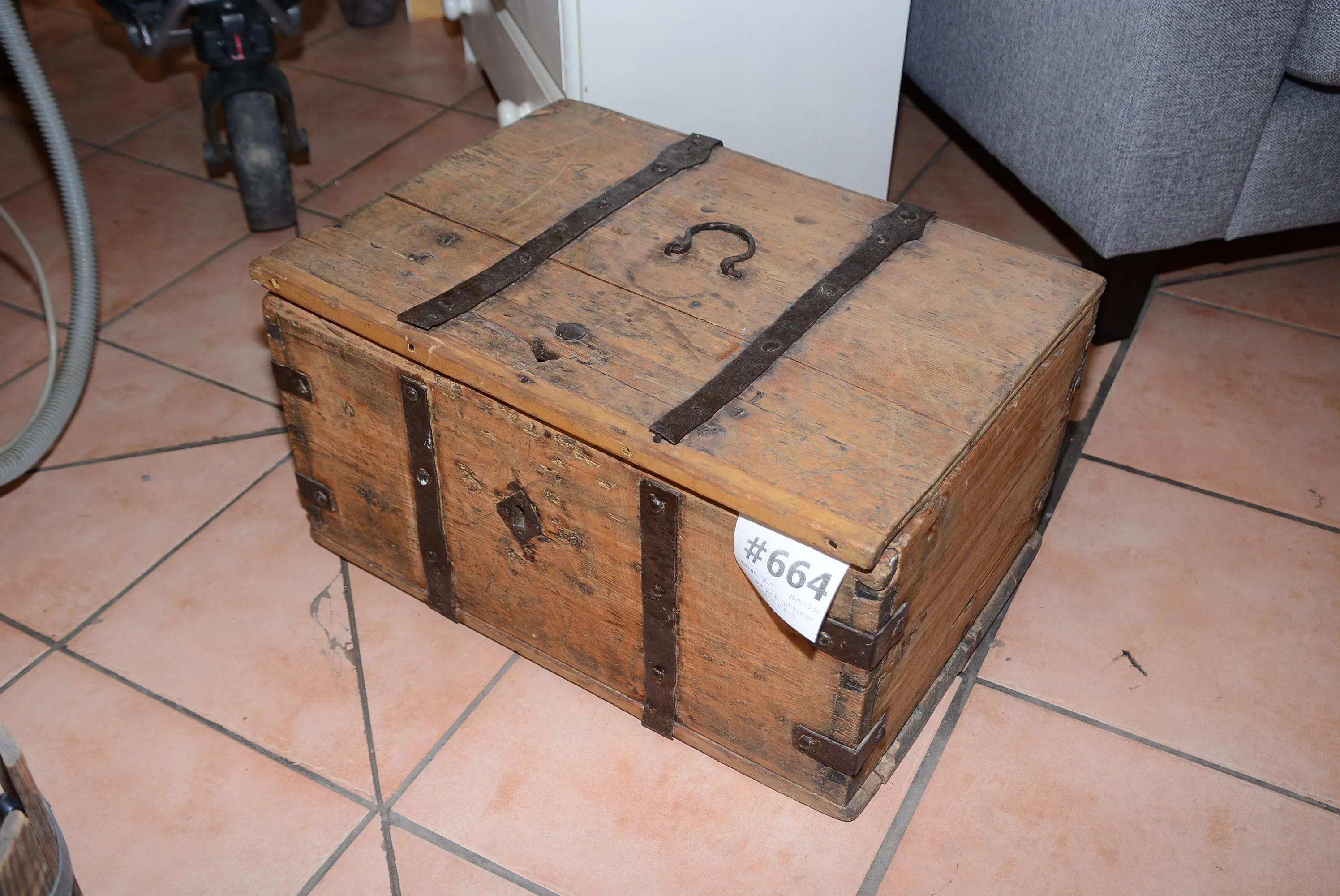 664. Kista med hjärtlås, nyckel saknas 54x35 cm, H: 30 cm