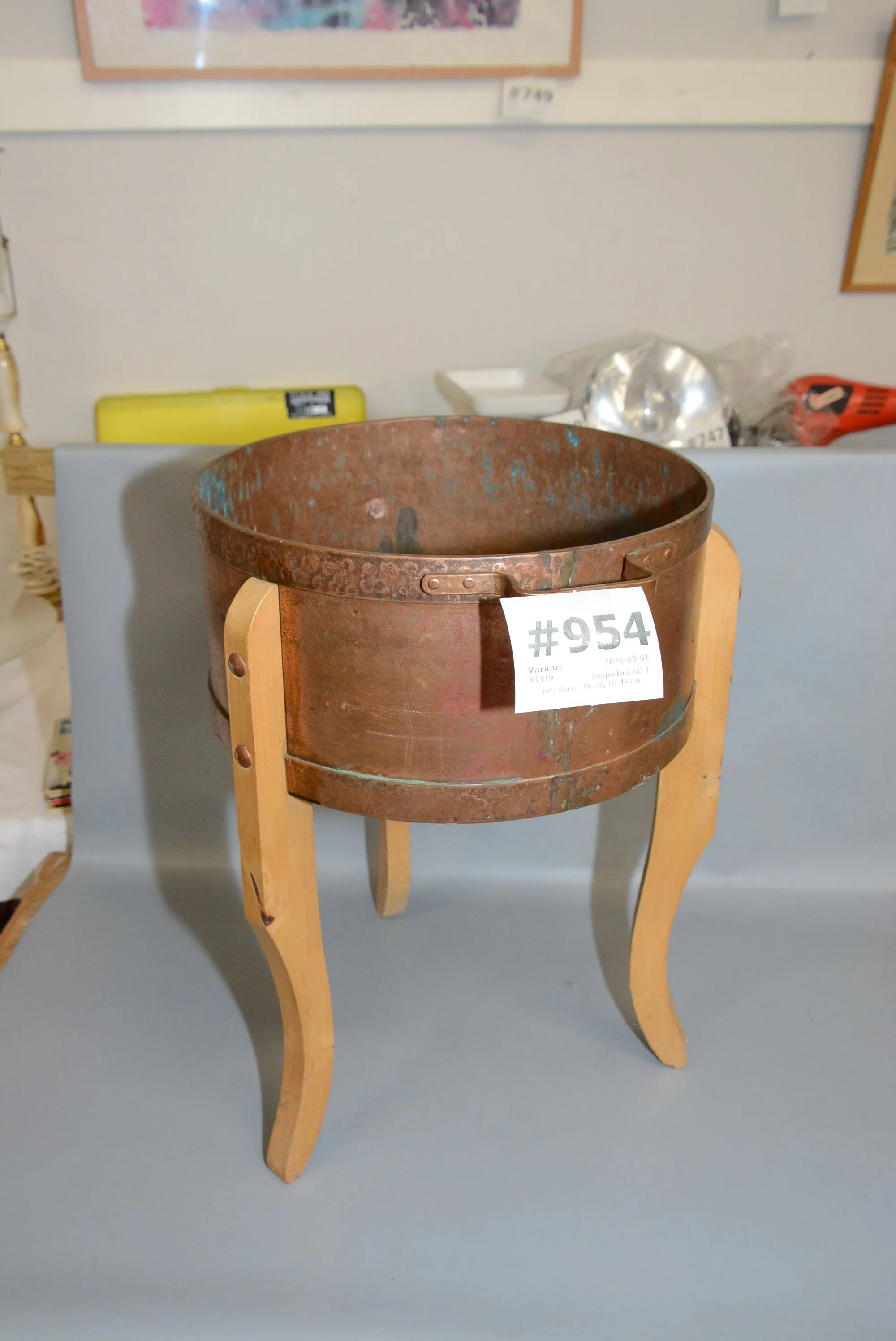 954. Kopparkastrull 3-ben diam: 35 cm, H: 48 cm