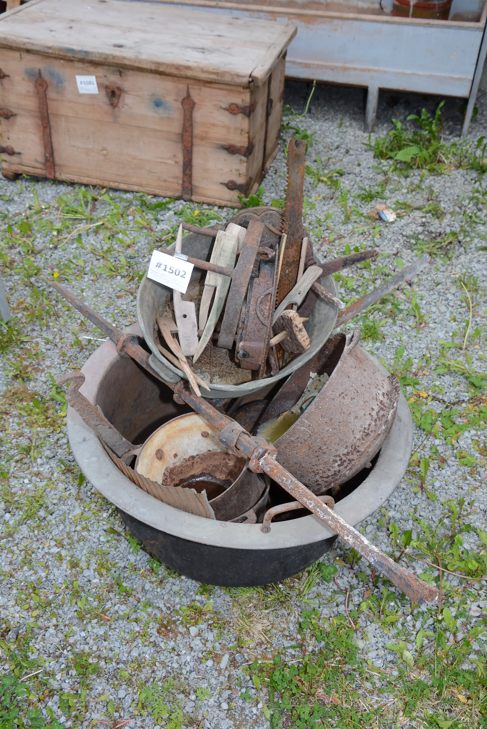 1502. Kopparkittel, järngrytor, våffeljärn mm