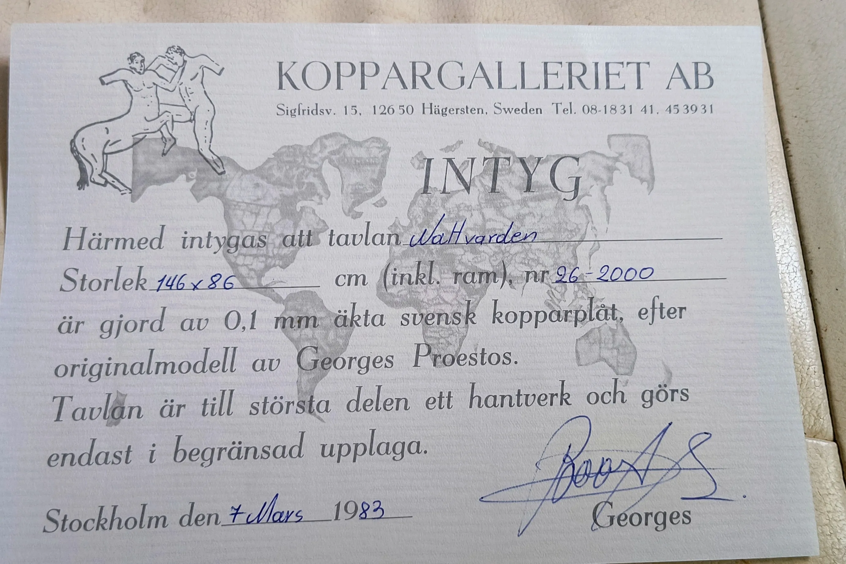 444. Koppartavla 73x133 cm inkl intyg