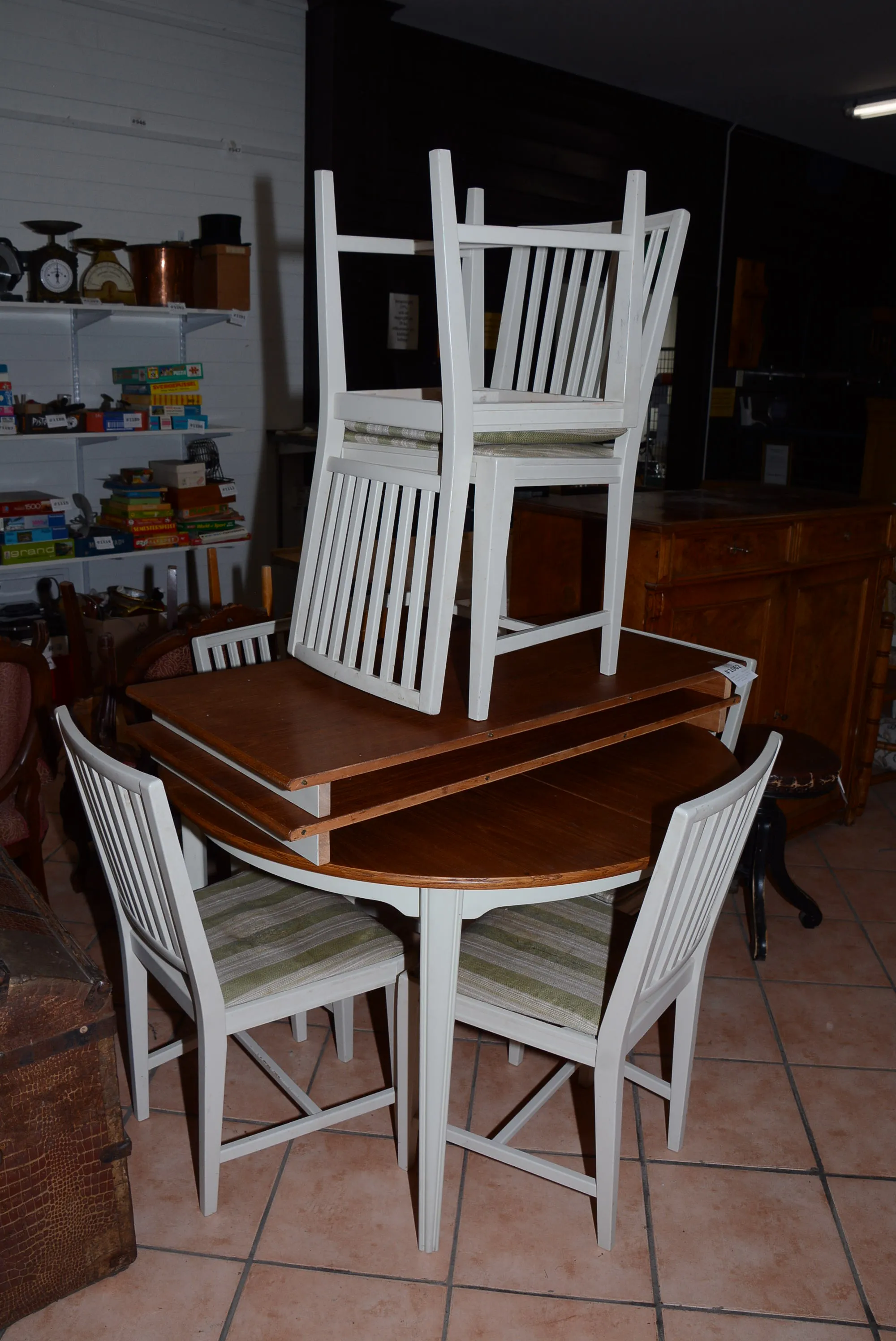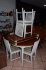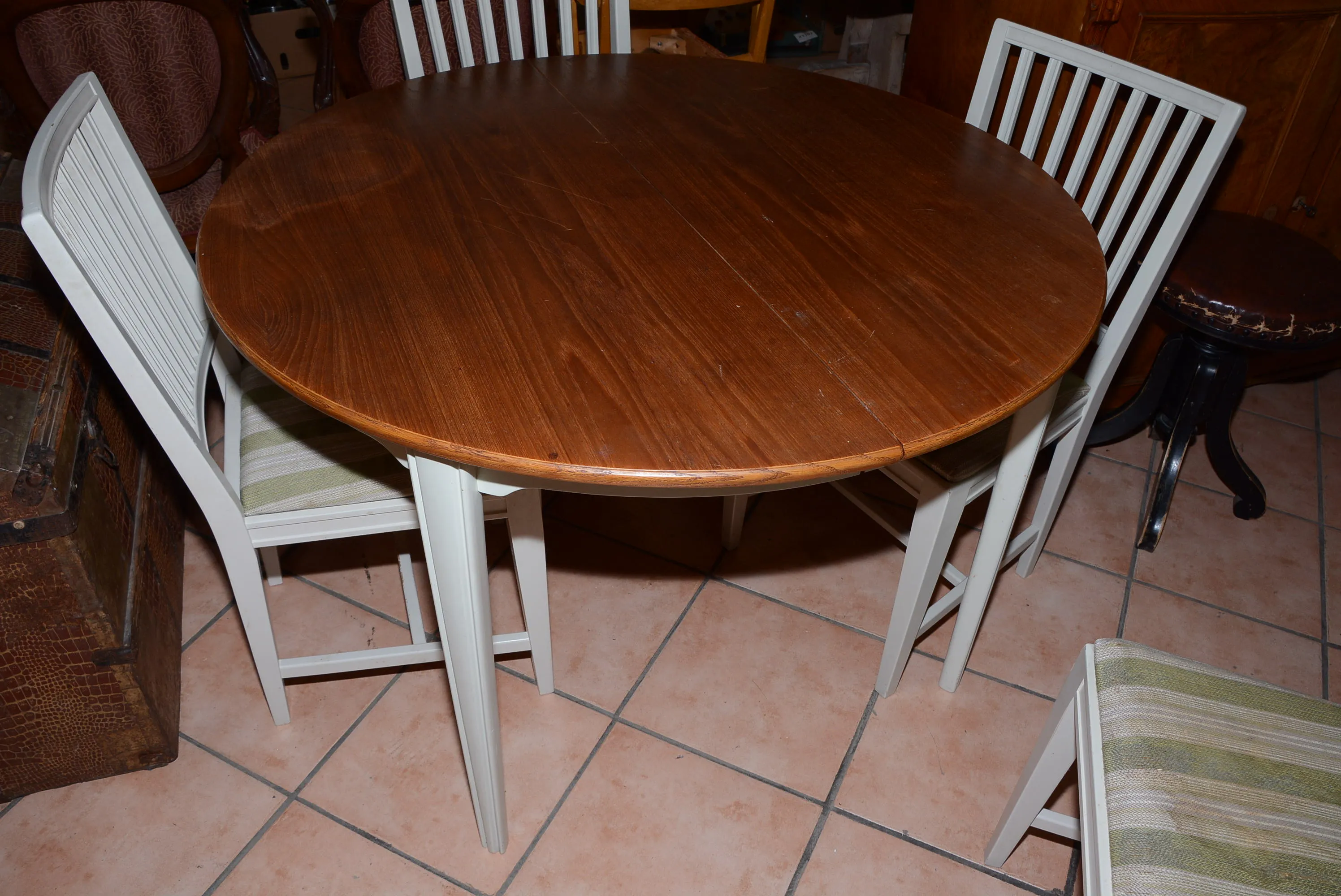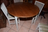 1062. Matbord diam: 110 cm, H: 73 cm, iläggsskivor 55x2 + stolar 6 st gustaviansk stil H: 86 cm