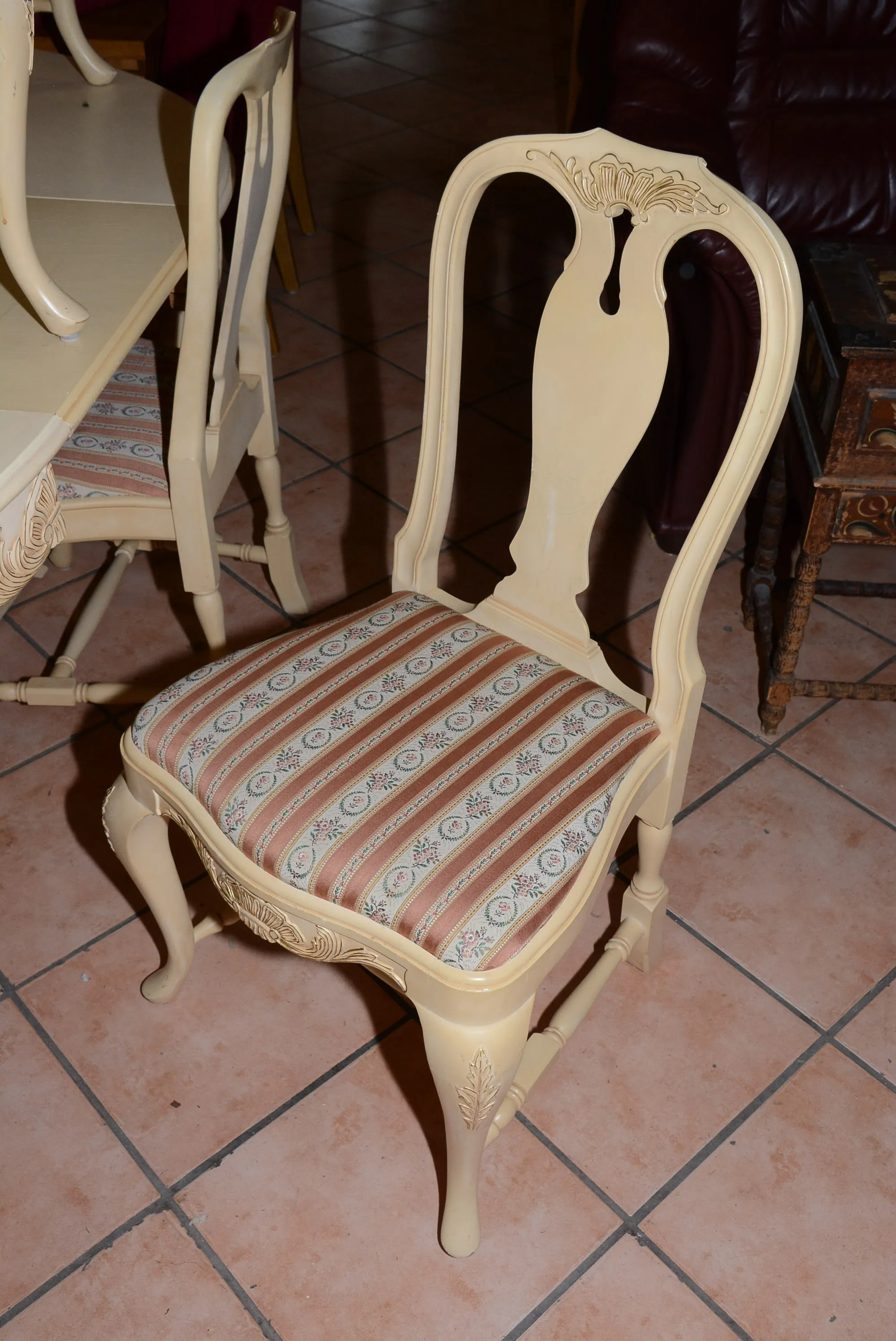 1084. Matbord diam: 110 cm, H: 74 cm, iläggsskivor 47x2, 23x2 + stolar 6 st H: 92 cm