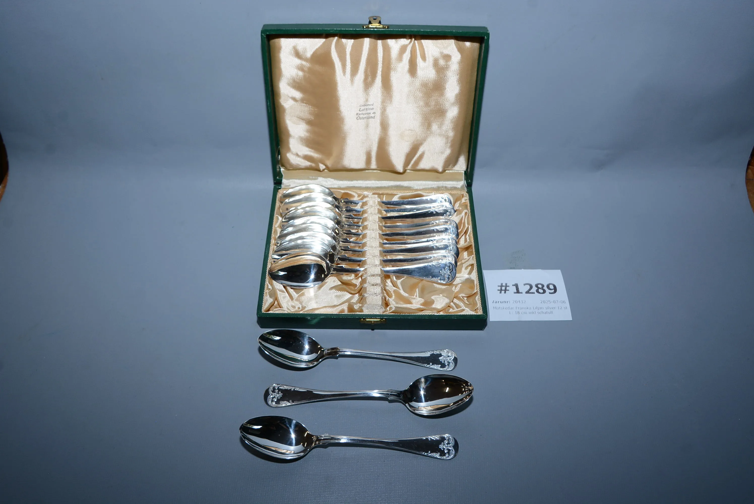 1289. Matskedar Franska Liljan silver 12 st L: 18 cm inkl schatull