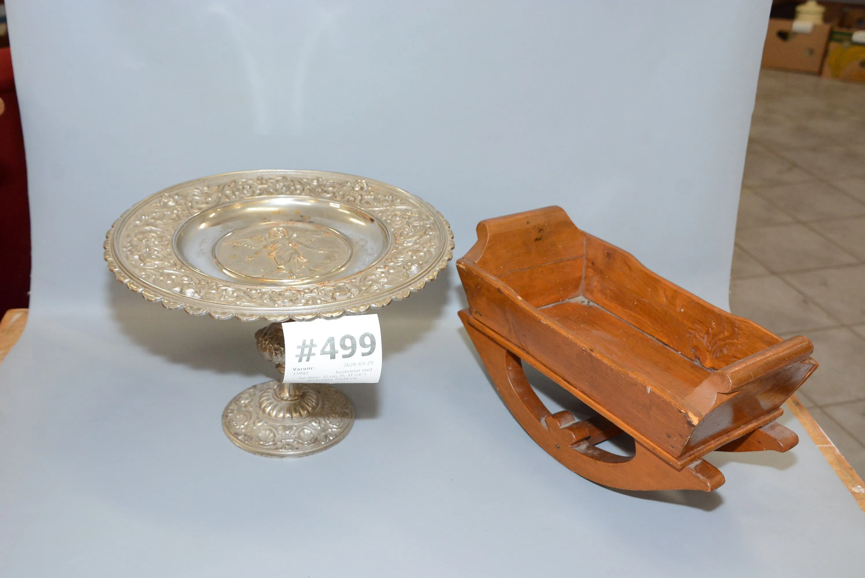 499. Nysilverfat med fot diam: 32 cm, H: 31 cm + dockvagga 33x16 cm