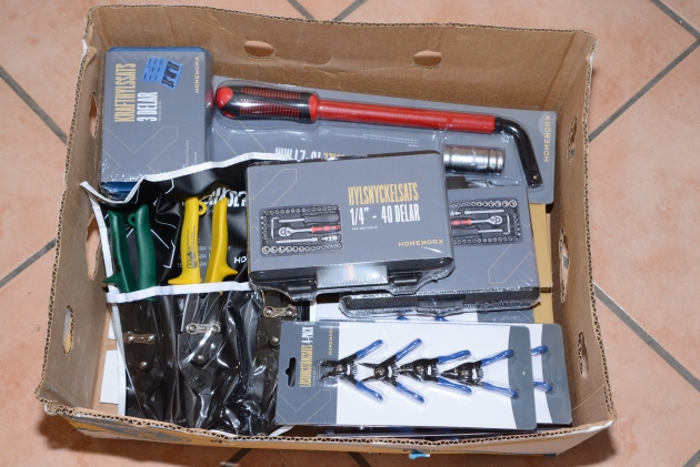 1146. Plåtsaxar 5 st, tänger 6 st, hylsnyckelsats 2 st 40 delar, hjulmutternyckel 1 st + krafthylssats 3 delar 3 st