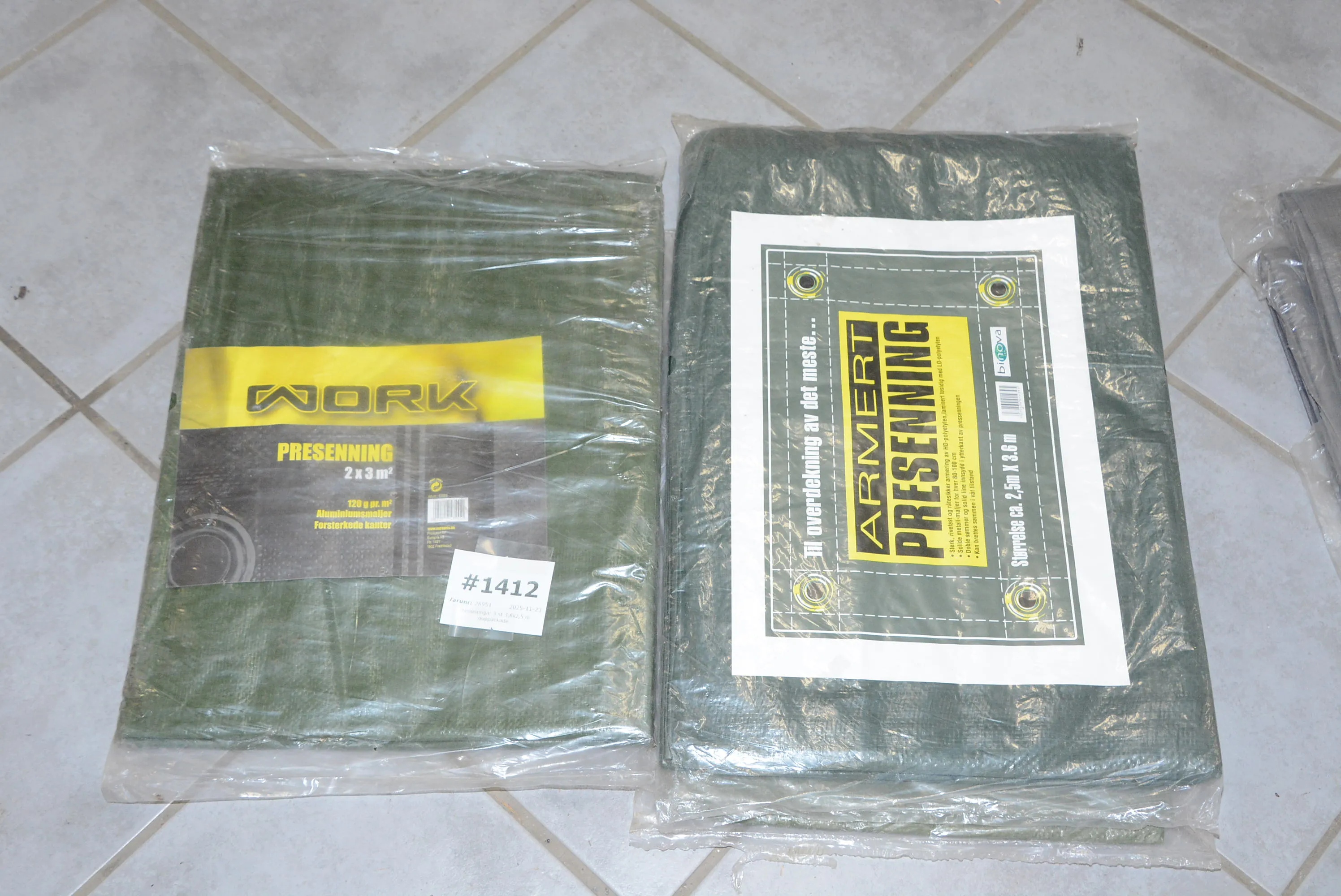 1412. Presenningar 3 st 3,6x2,5 m, 2x3 m ouppackade