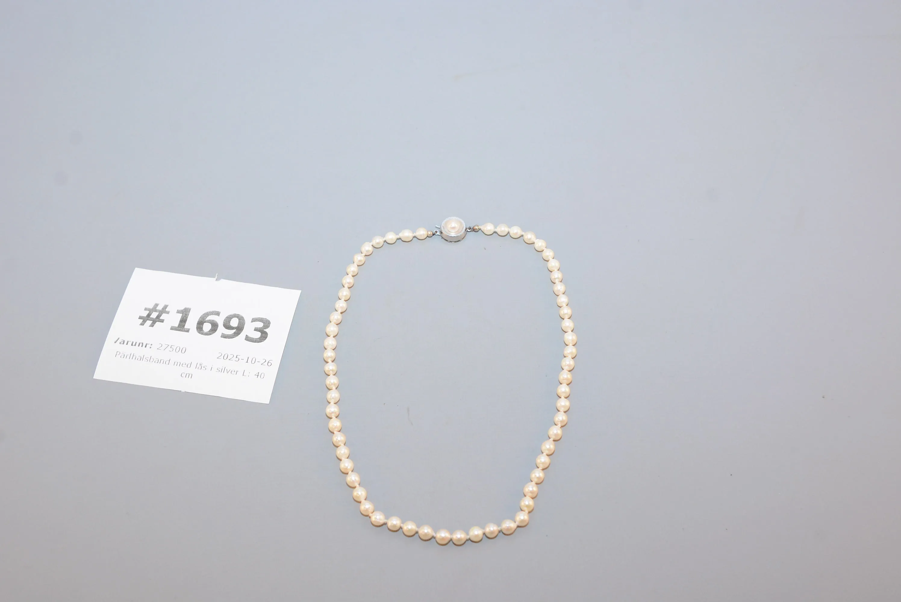 1693. Pärlhalsband med lås i silver L: 40 cm