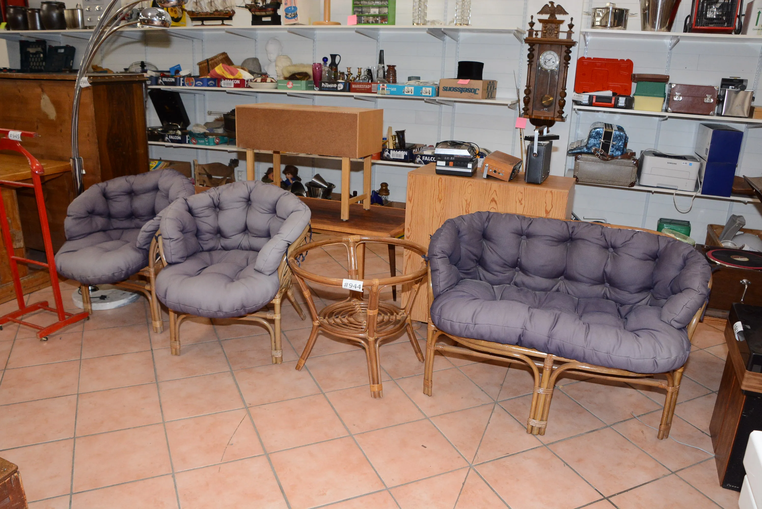 944. Rottinggrupp soffa 2-sits L: 115 cm, H: 75 cm, fåtöljer 2 st B: 70 cm, H: 80 cm + bord, glasskiva saknas