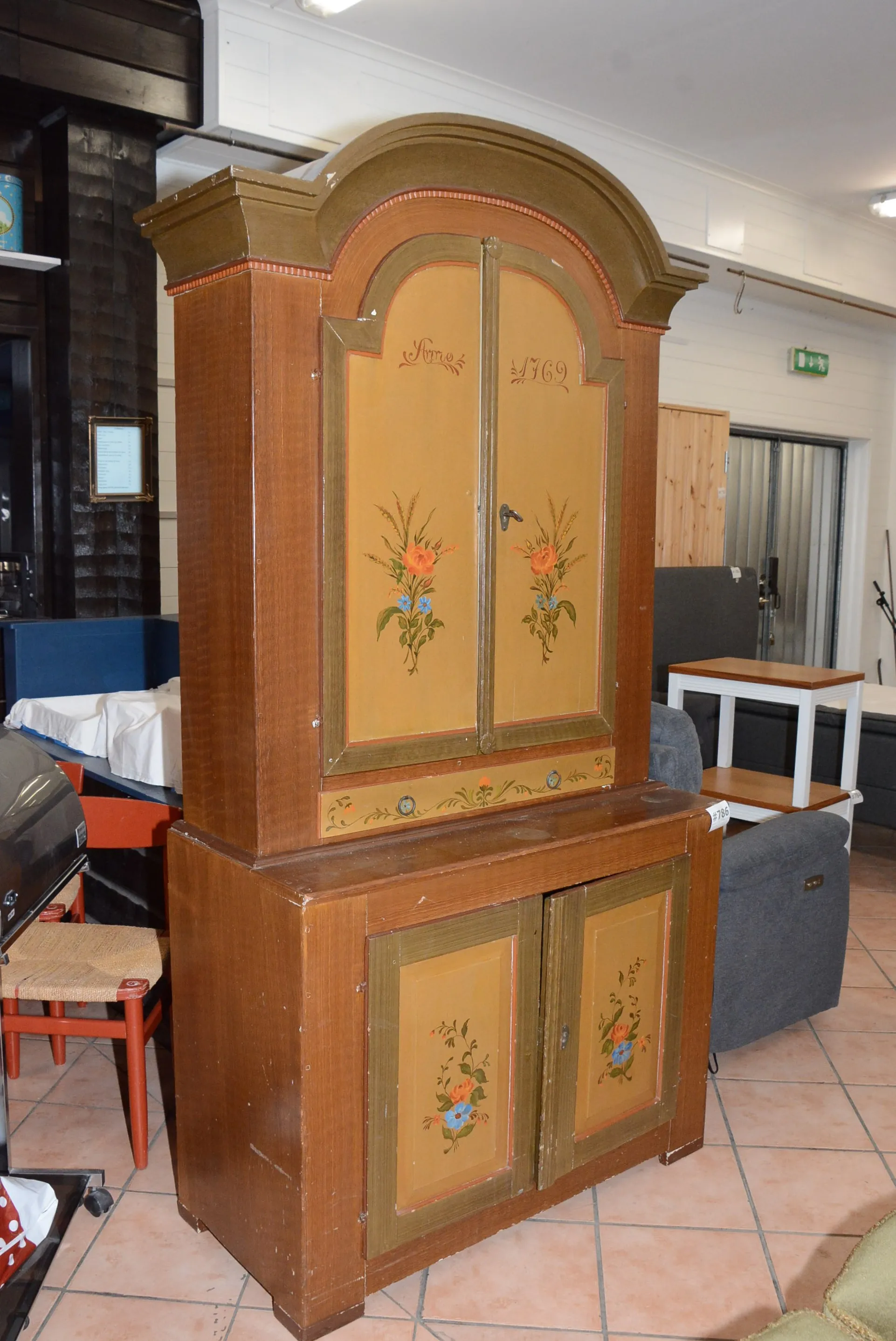 786. Skänkskåp allmoge daterat 1769, senare bemålning 110x50 cm, H: 220 cm