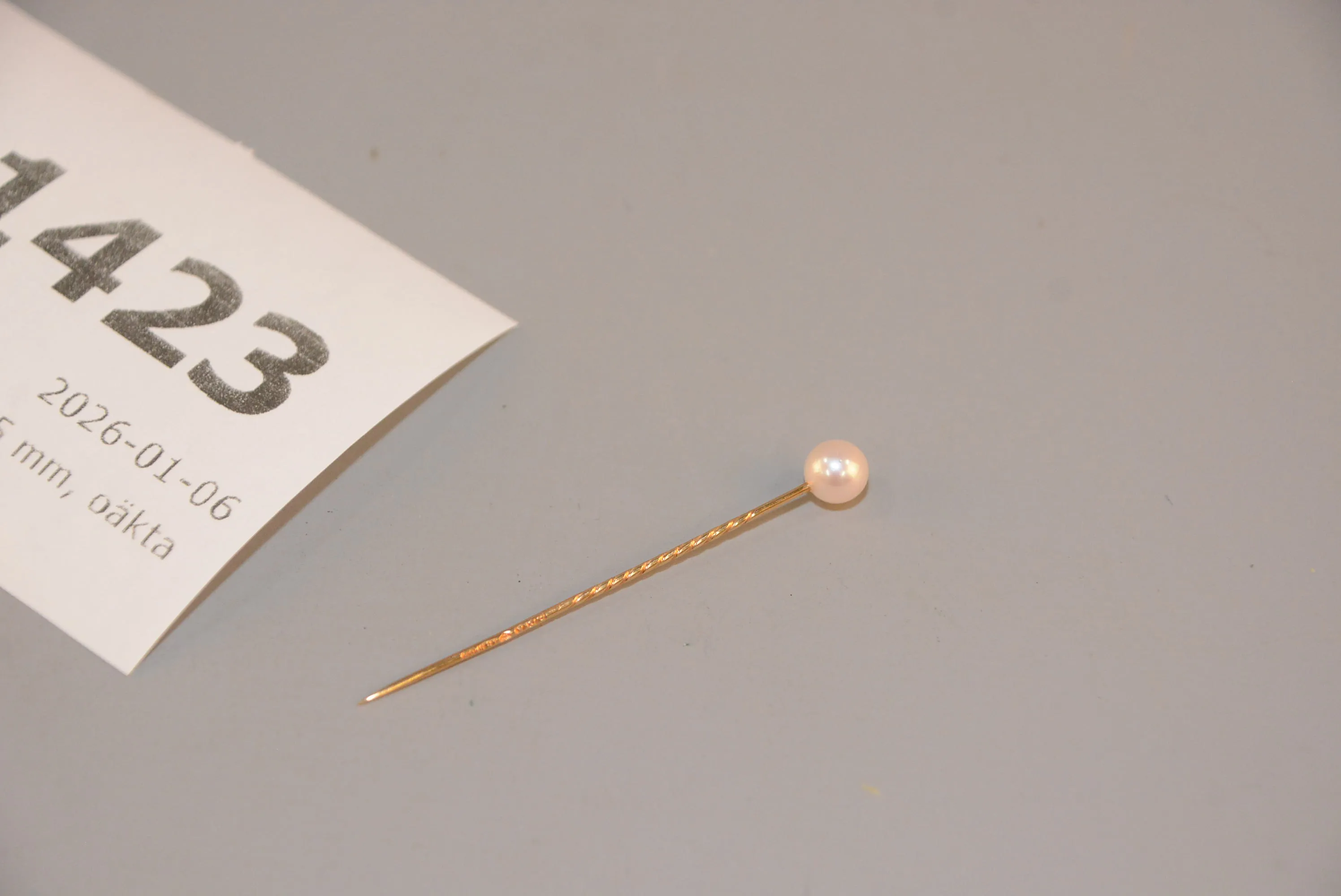 1423. Slipsnål guld 18K L: 55 mm, oäkta pärla