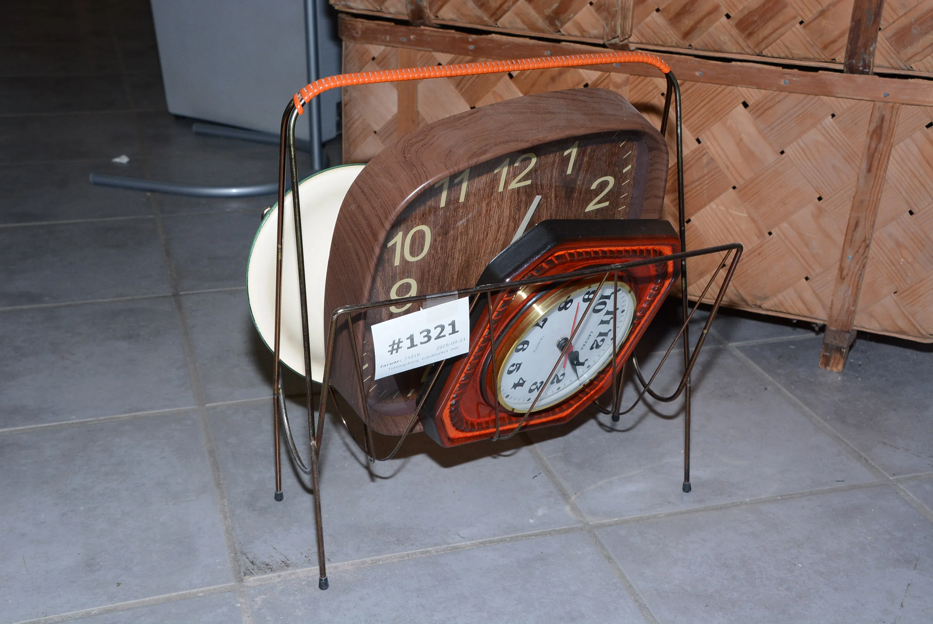 1321. Tidningskorg, köksklockor mm