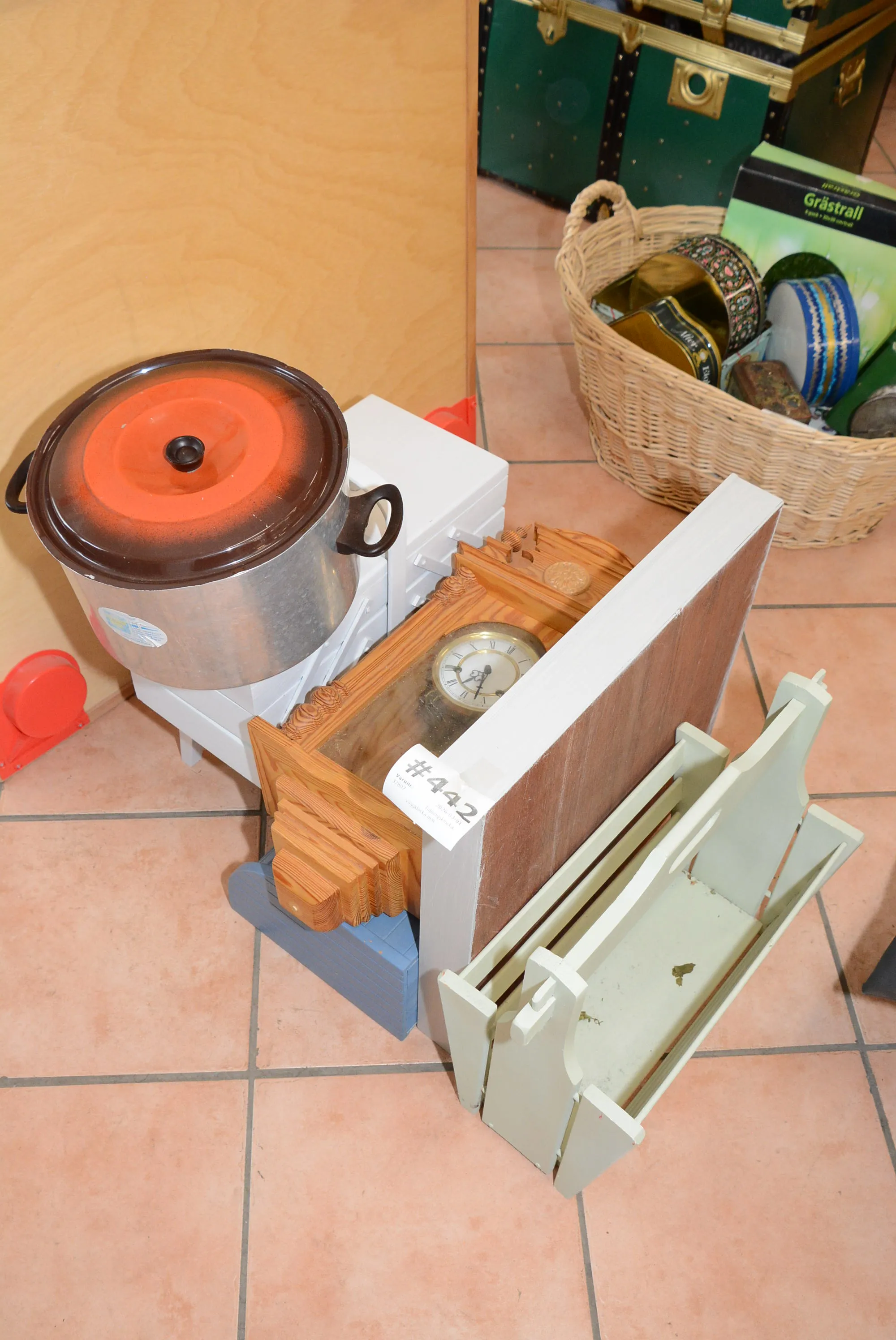 442. Tidningskorg, väggklocka mm