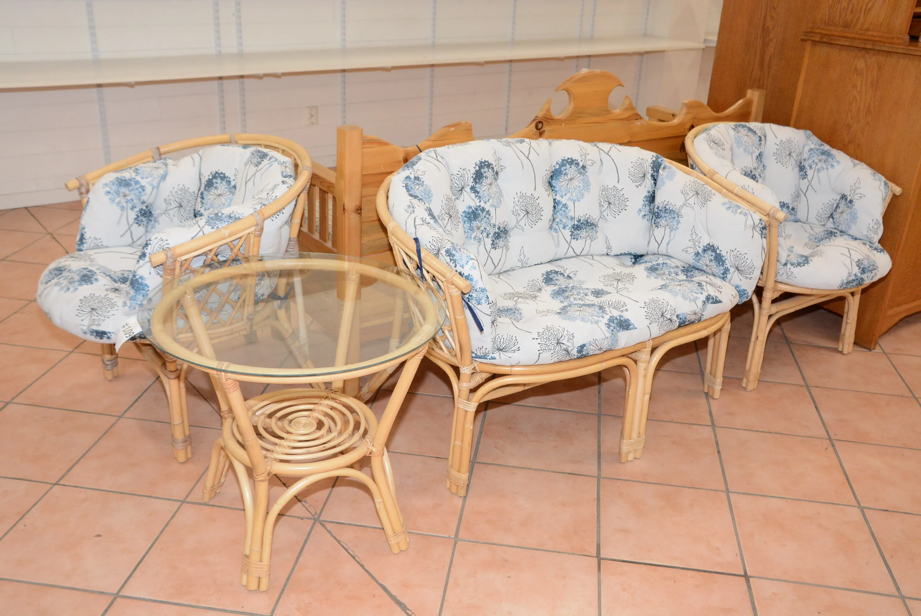 109. Trädgårdsmöbel rotting 2-sits L: 110 cm, H: 73 cm, fåtöljer 2 st B: 70 cm, H: 73 cm+ bord diam: 65 cm, H: 58 cm