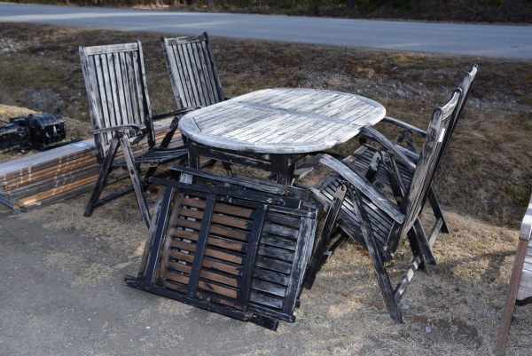 764. Trädgårdssbord med iläggsskiva 145x90 cm, H: 77 cm + stolar 6 st H: 105 cm