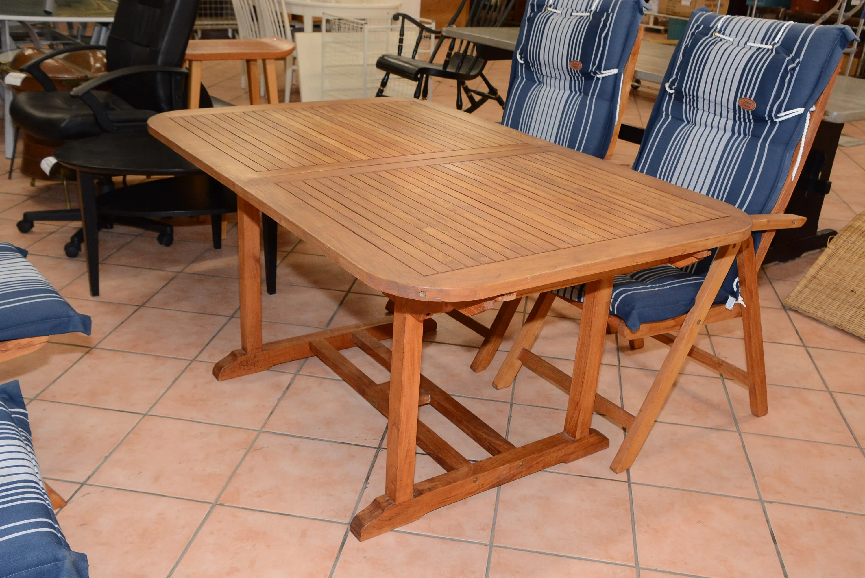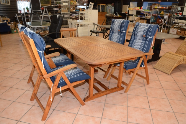 121. Utemöbelsbord Schou 150x100 cm, H: 76 cm, iläggsskiva 60x1, stolar 4 st